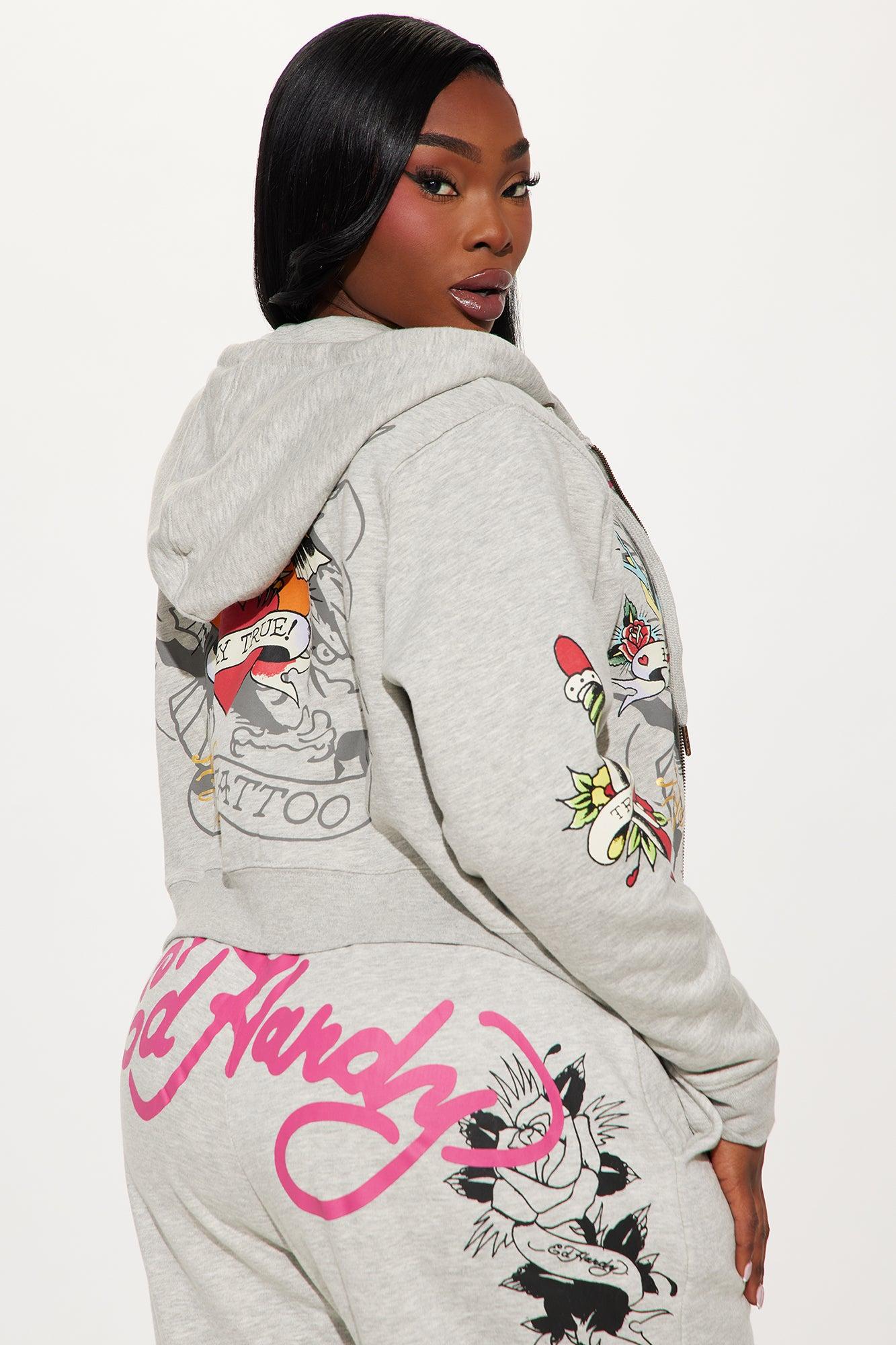 Available In Heather Grey. Hoodie Front And Back Screen Ed Hardy Graphic Zipper Detail Stretch Pair To "Ed Hardy Rose And Sword Sweatpant" Disclaimer: Due To The Printing Process A Difference In Saturation May Occur. Each Garment Is Unique. 55% Cotton 45% Polyester Imported