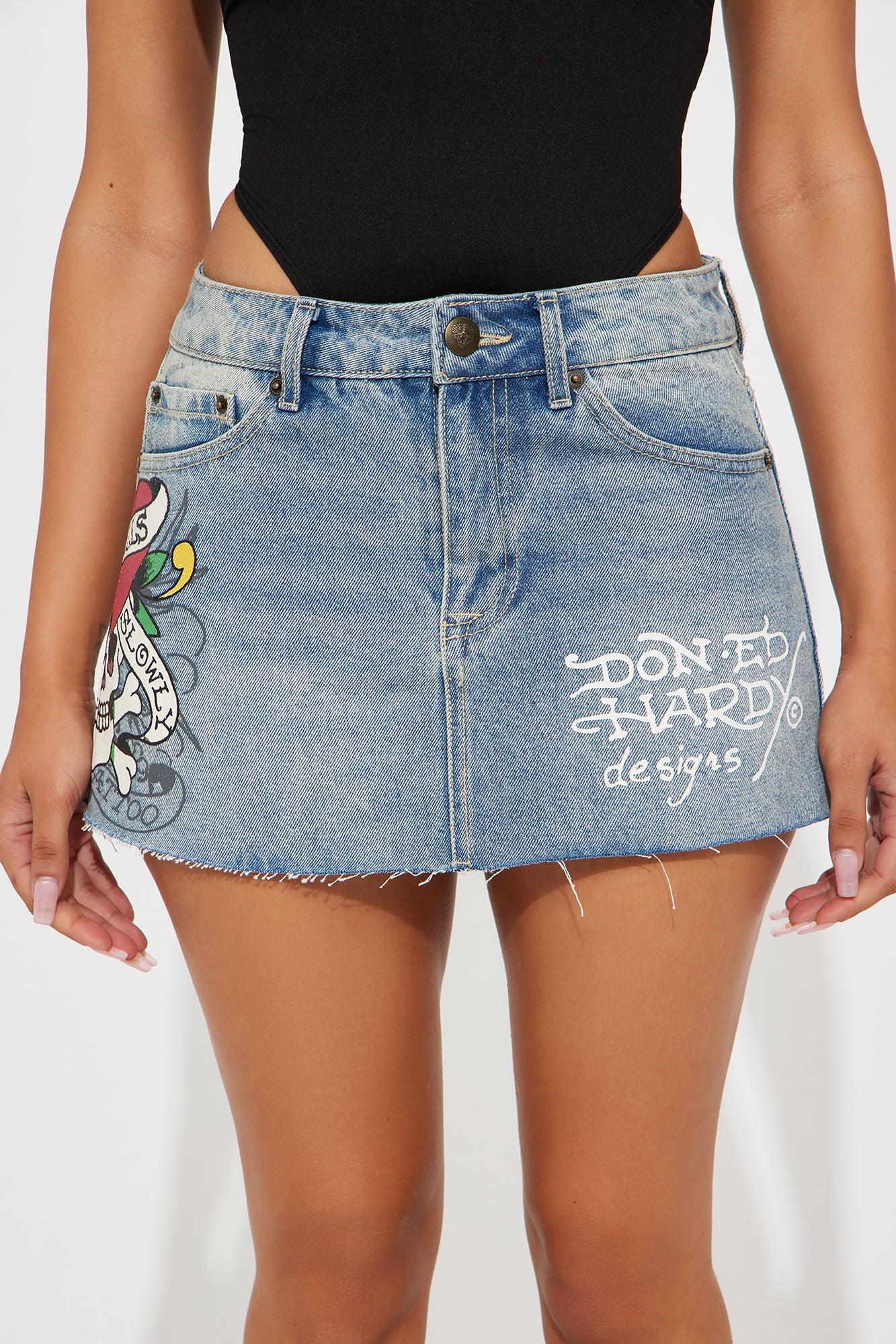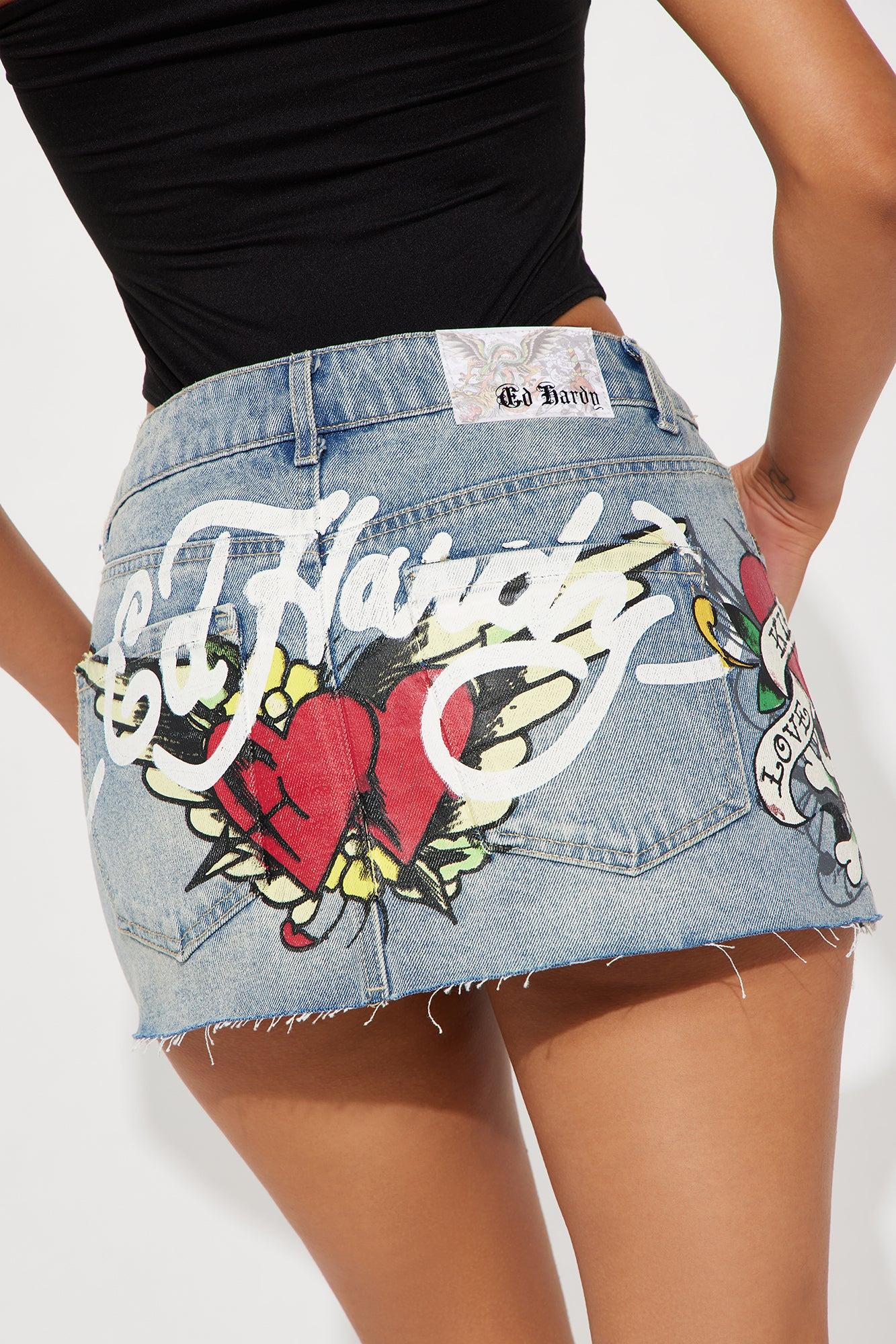 Ed Hardy Skull Denim Mini Skirt - Light Wash