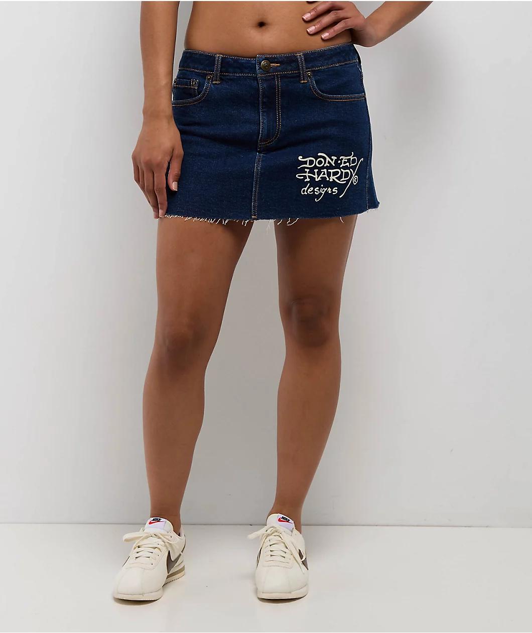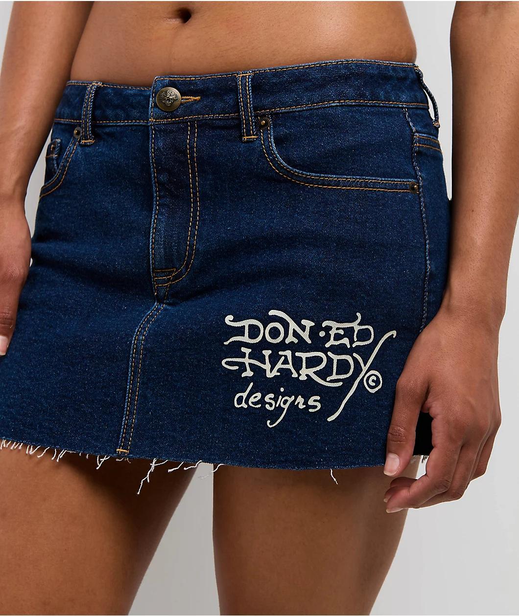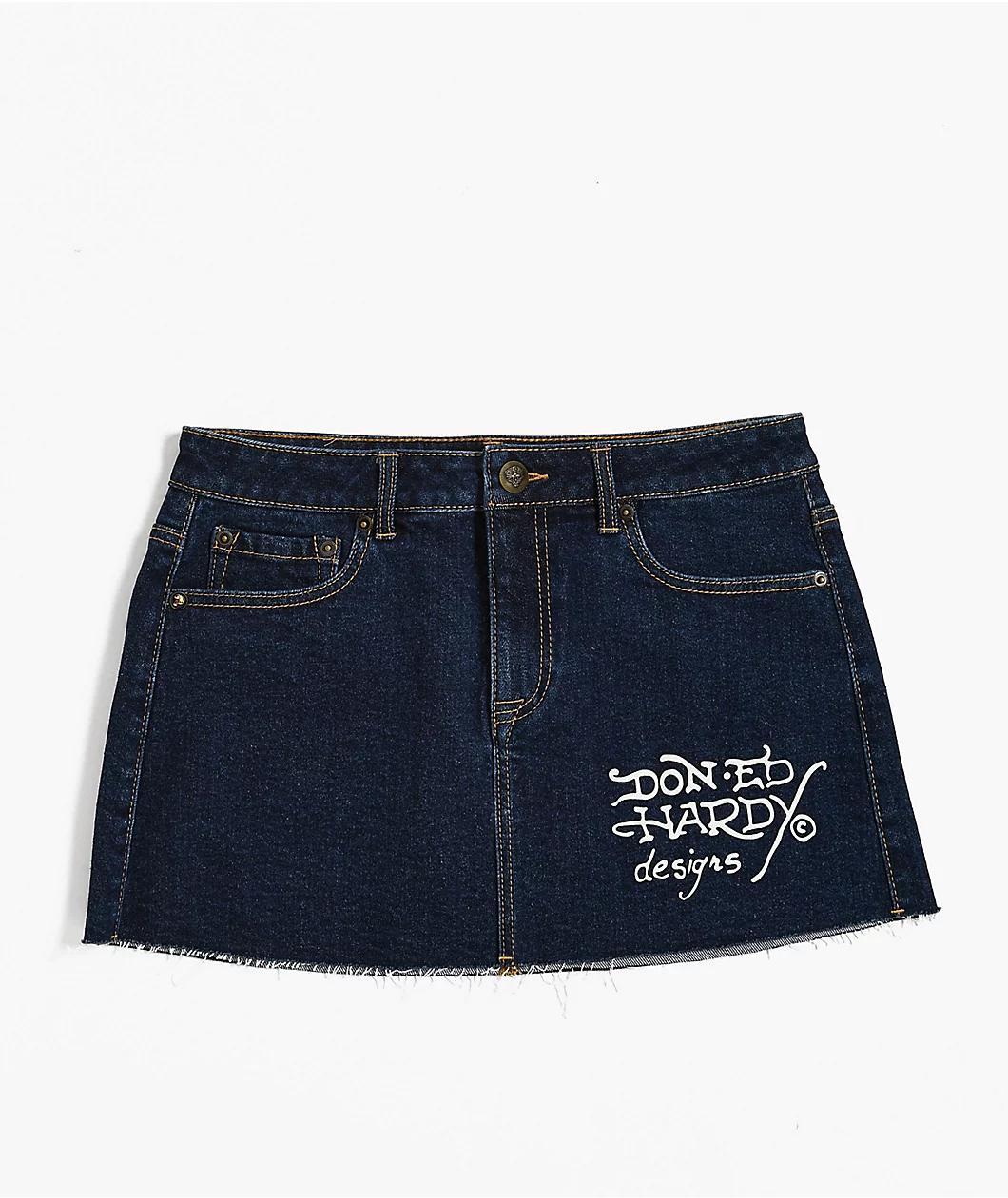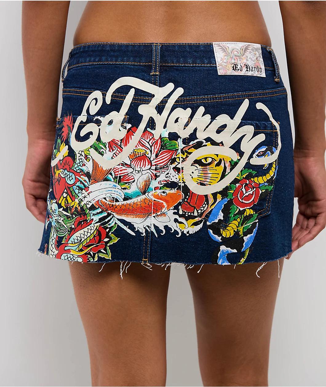 Bring bold Y2K energy to your look with the Tattoo Collage cutoff mini skirt from Ed Hardy in a dark wash denim. The back of the skirt shows off tattoo-inspired art with animals, plants, and symbols. This jean skirt has a raw cutoff hem and bold Ed H