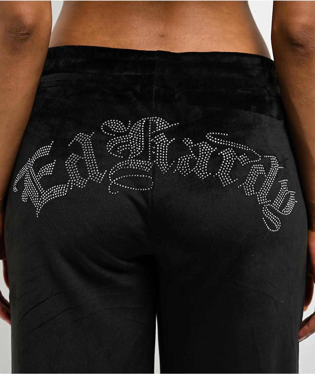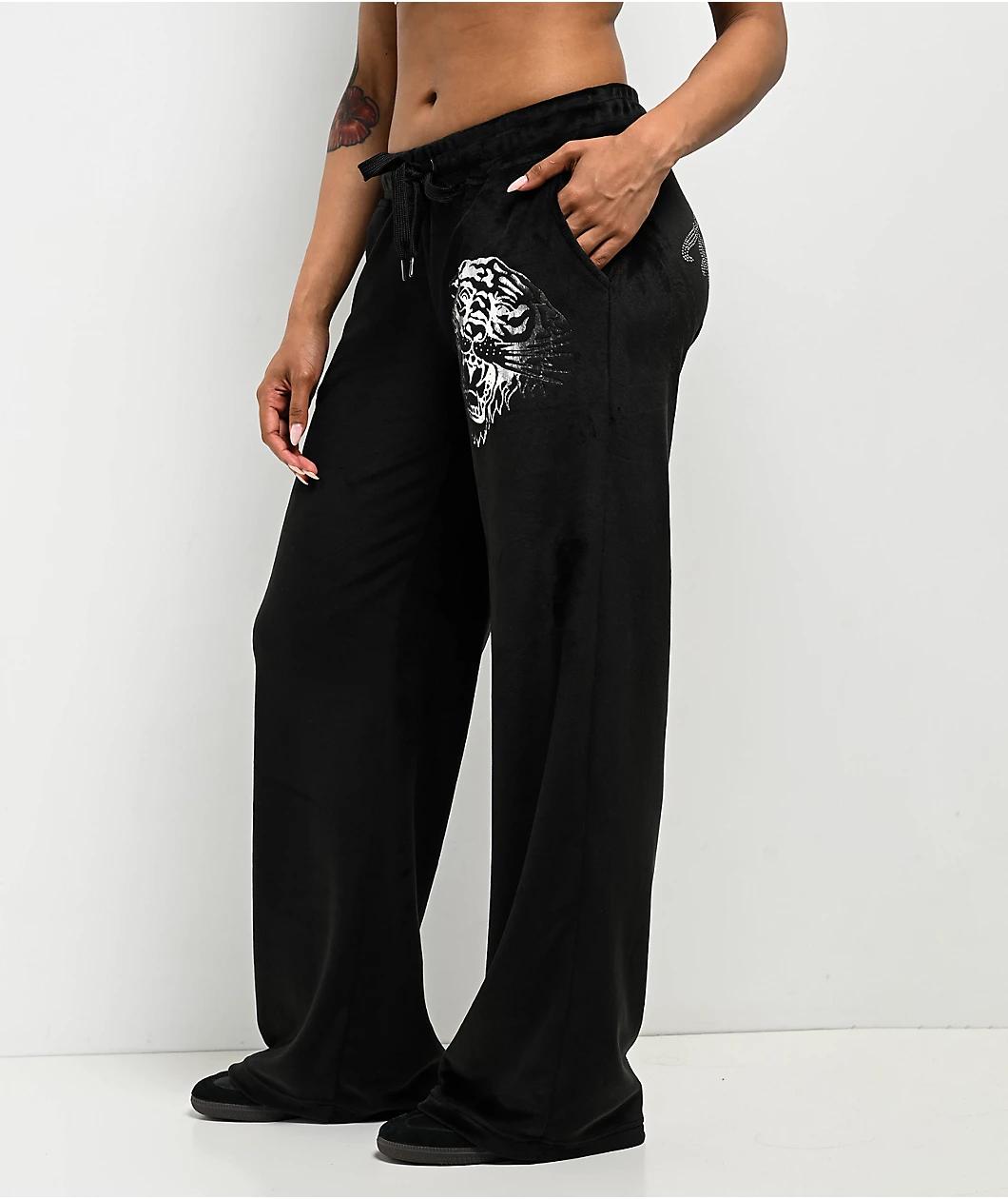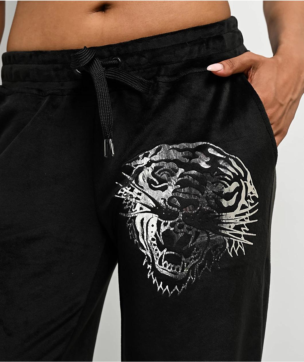 Delivered in a super soft polyester velour fabric, Ed Hardy offers the black colorway of the Tiger Head sweatpants with a shiny silver foil graphic and silver rhinestone detailing as flashy luxury loungewear. Displaying arched Old English script acr