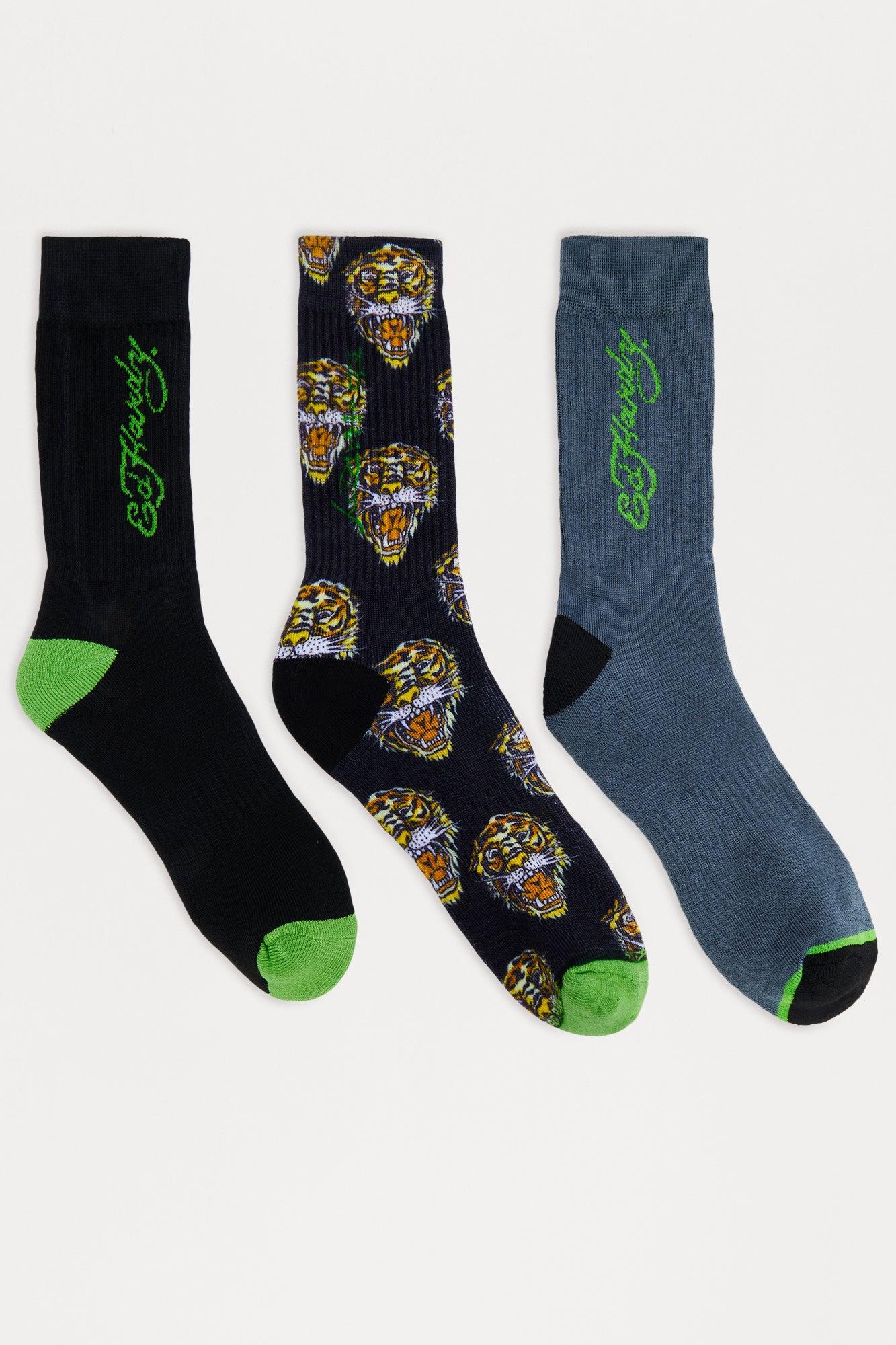 Ed Hardy Tiger Head Socks 3 Pack - Black/Green