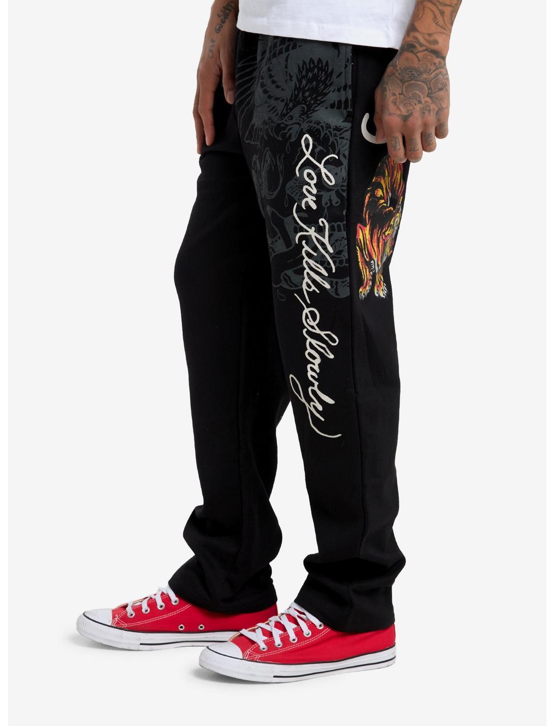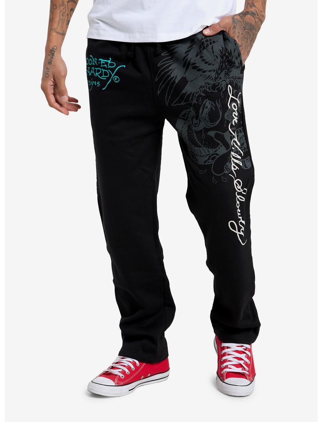 The legendary Ed Hardy is here to stay. These black sweatpants are decorated with colorful and greyscale images of his tattoo designs, such as a tiger and an eagle fighting a snake. His various logos appear on the front and across the back, as well as the phrase "Love Kills Slowly". These sweatpants have an elasticated, drawstring waistband, side pockets and a back pocket.60% cotton; 40% polyesterWash cold; dry lowImportedListed in men's/unisex sizesModel is 6'1"Model wears size Medium