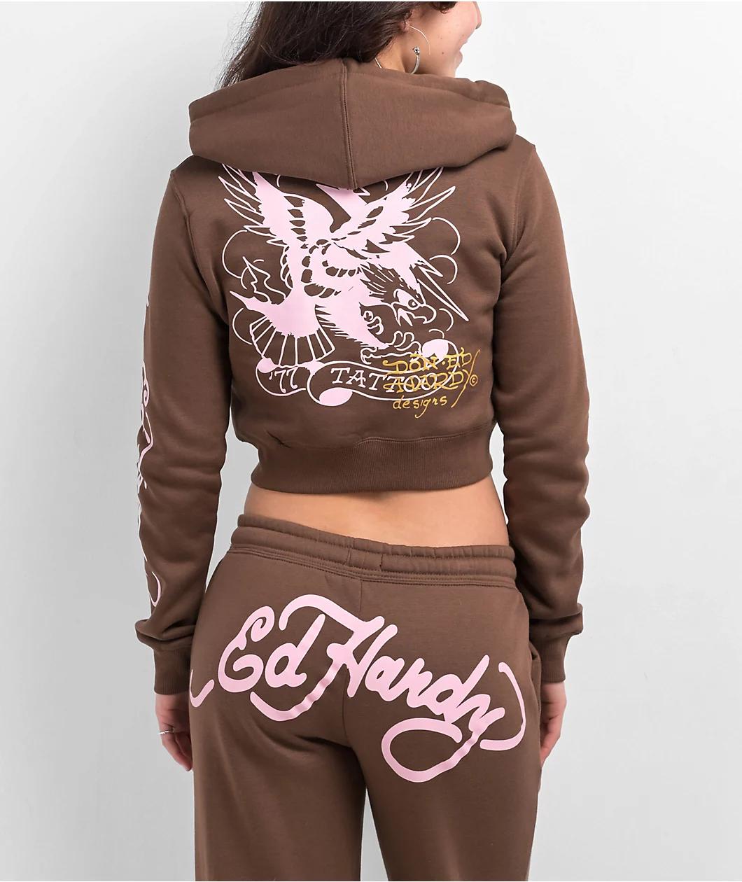 Add a Y2K vibe to any outfit with the Tiger Mountain crop zip hoodie from Ed Hardy, landing in a "Cocoa" brown color. The front and back showcase vintage tattoo art alongside gold branding, with signature branding running down the left sleeve for an