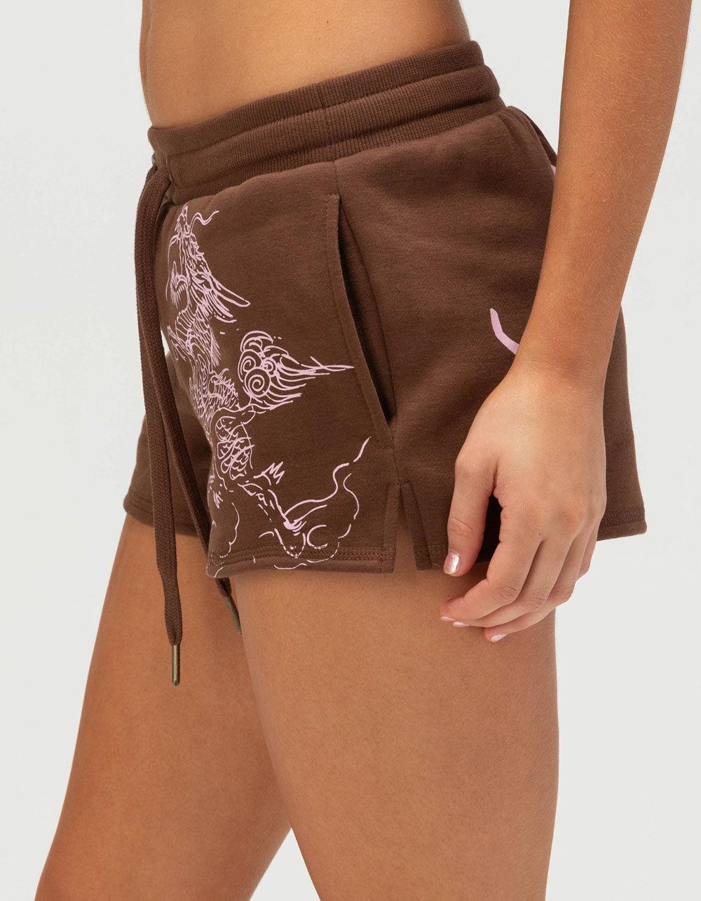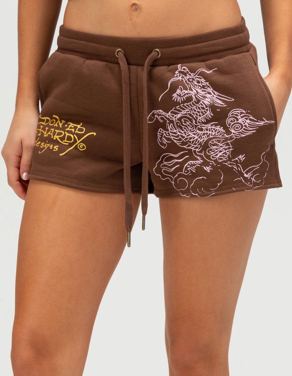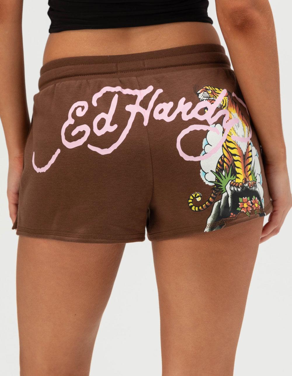 Ed Hardy Tiger Mountain Fleece Shorts. Embrace comfort and style with our Y2K fleece shorts. Featuring an adjustable drawstring and an ultra soft cotton-blend fleece. Complete with layered archival Ed Hardy graphics and logos. Side seam pockets. Approximate inseam: 2". 60% Cotton 40% Polyester. Machine wash. Imported.