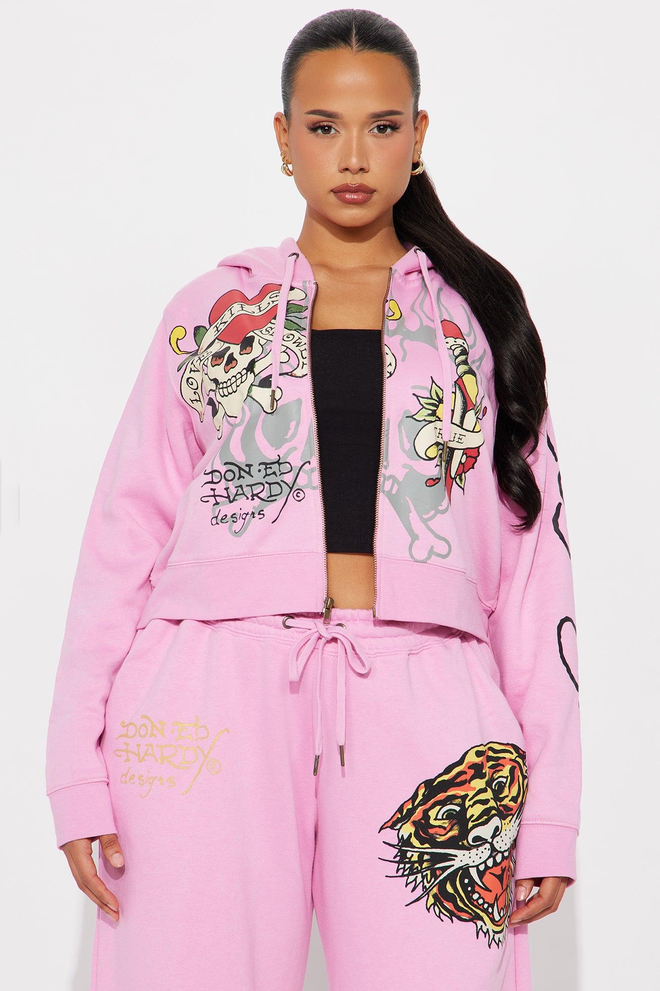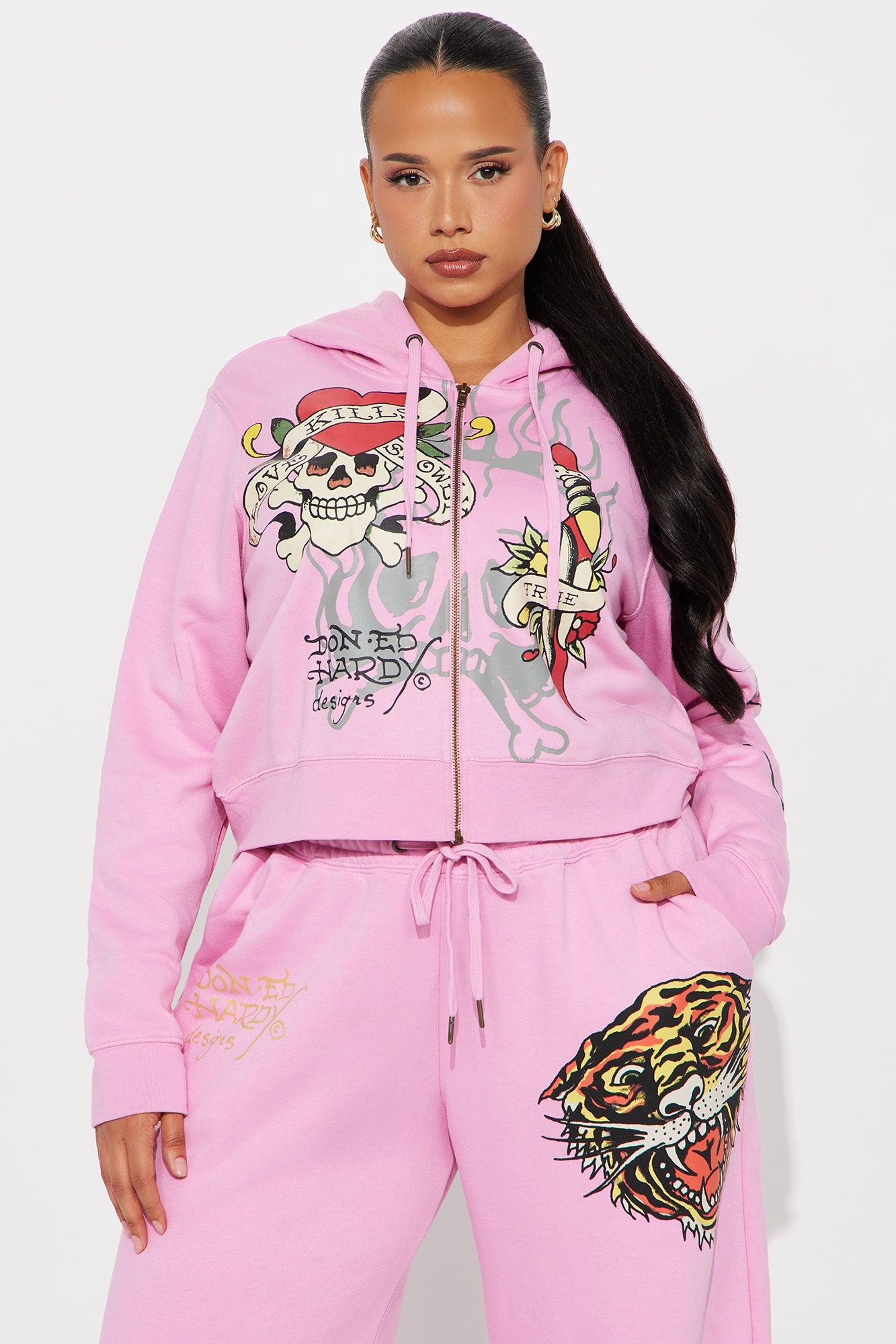 Available In Pink. Zip Front Hoodie Drawstrings Ed Hardy Graphic Front, Sleeve and Back Screen Stretch Pair To "Ed Hardy Tiger Roar Pant" Disclaimer: Due To The Specialized Screen Printing Process A Difference In Saturation May Occur. Each Garment Is Unique. 55% Cotton 45% Polyester Imported