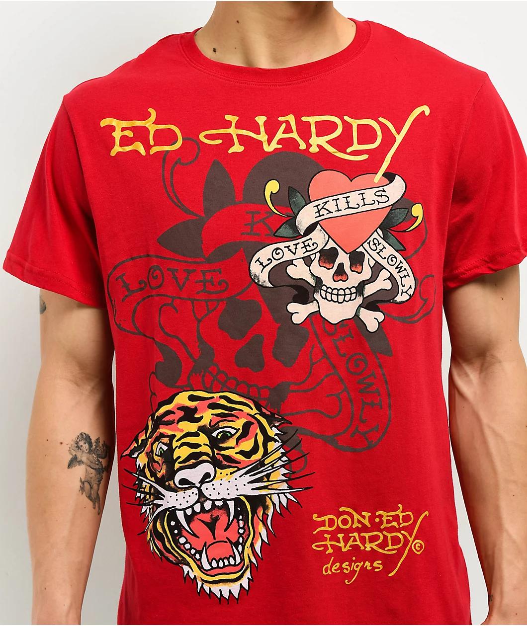The Y2K icons at Ed Hardy present the Tiger Skull t-shirt in a bright red colorway. Vintage tattoo artwork of a Skull and Tiger head decorates the front for a classic, throwback look. Gold branding on the front and back adds eye-catching shine.
