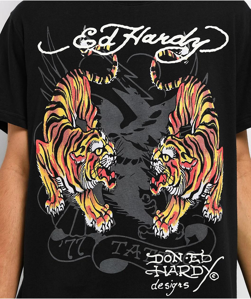 Embrace a classic Y2K vibe with the Ed Hardy Tigers t-shirt in a sleek black colorway. Printed across the chest is cursive branding, while two mirrored roaring Tigers are displayed underneath. The back of the tee boasts the initials of the renowned t