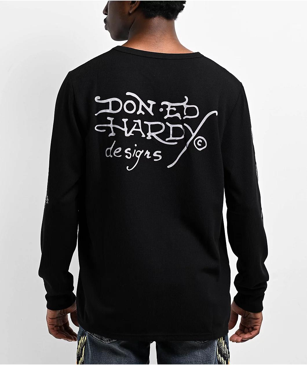 Delivering a 2000s undertone, the Tigers thermal long sleeve t-shirt from Ed Hardy arrives in a sleek black colorway. Providing a cozy fit, this long sleeve is constructed with a polyester blend thermal fabric. Showcasing traditional tattoo artwork f