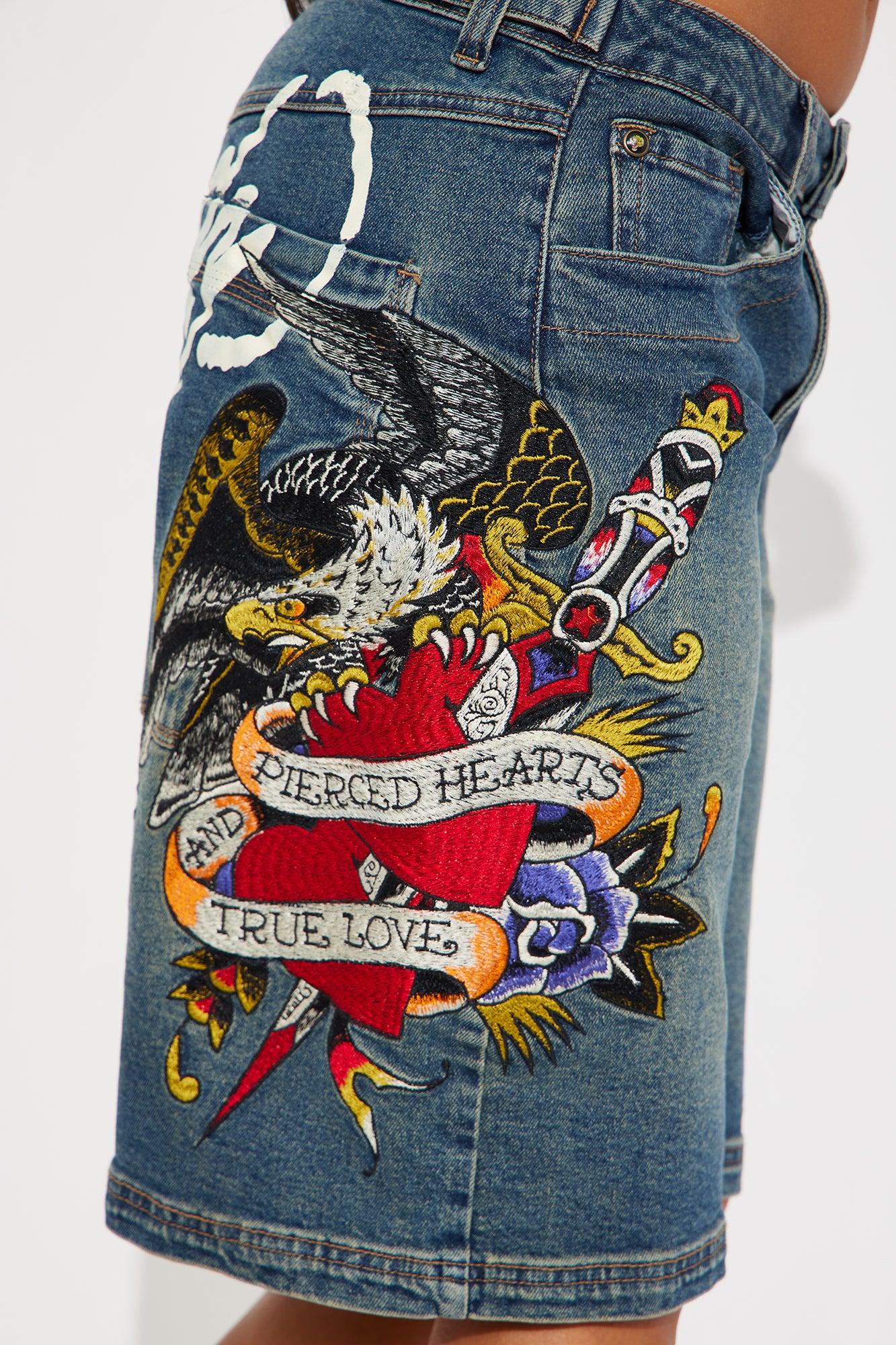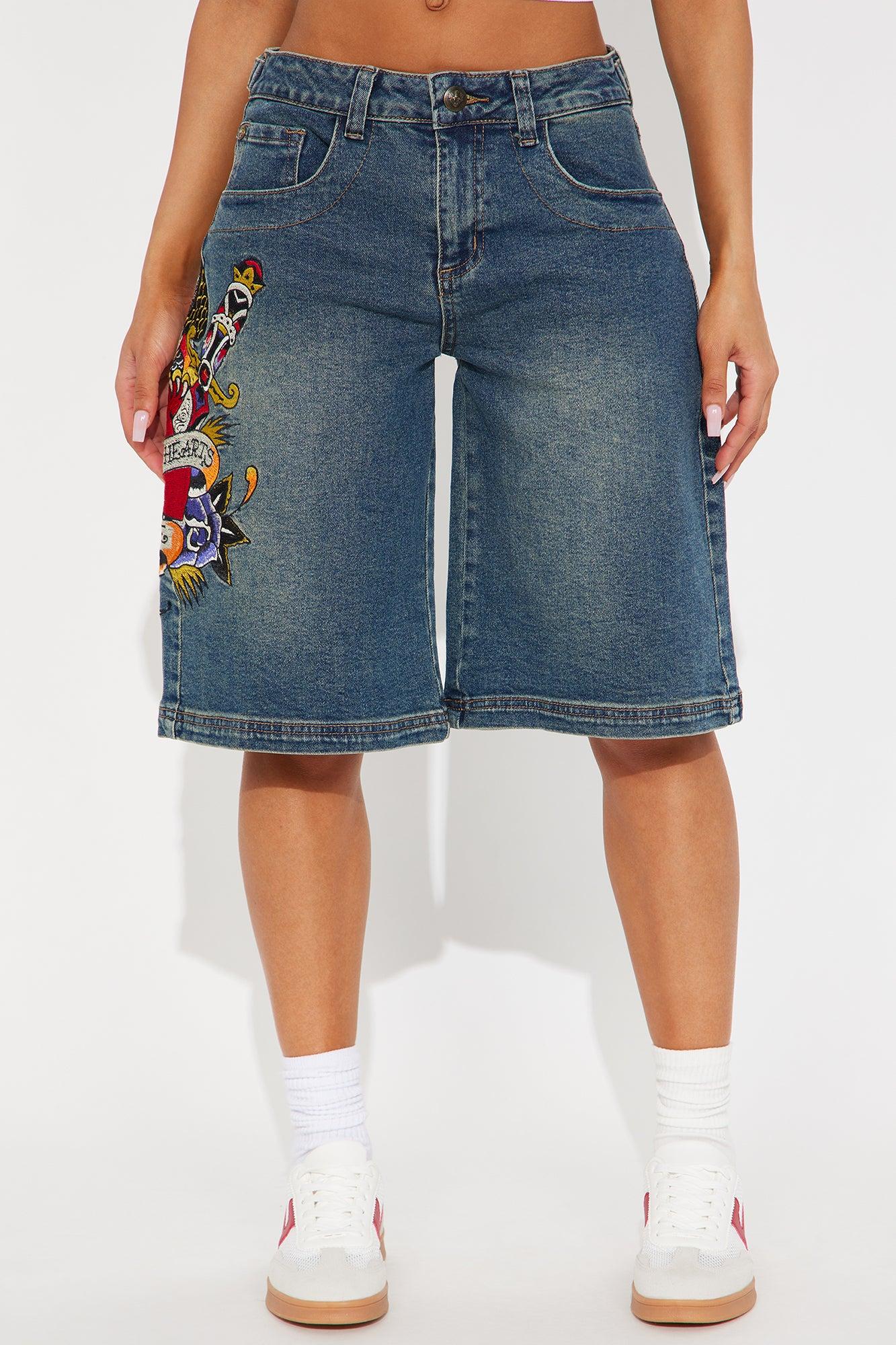 Available In Medium Wash. Denim Jort 5 Pocket Printed Detail Low Stretch Tinted 12.5" Inseam 12" High Rise Disclaimer: Due To The Printing Process A Difference In Saturation May Occur, each Garment Is Unique. Disclaimer: Due To The Specialized Wash, Each Garment Is Unique. 99% Cotton 1% spandex Imported