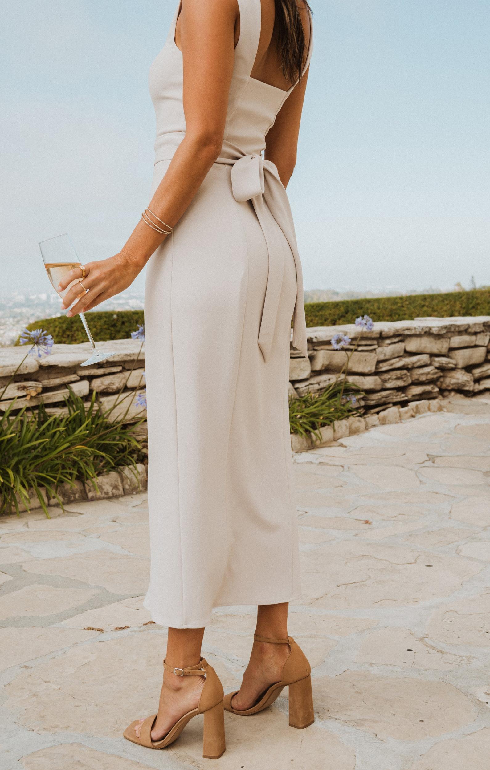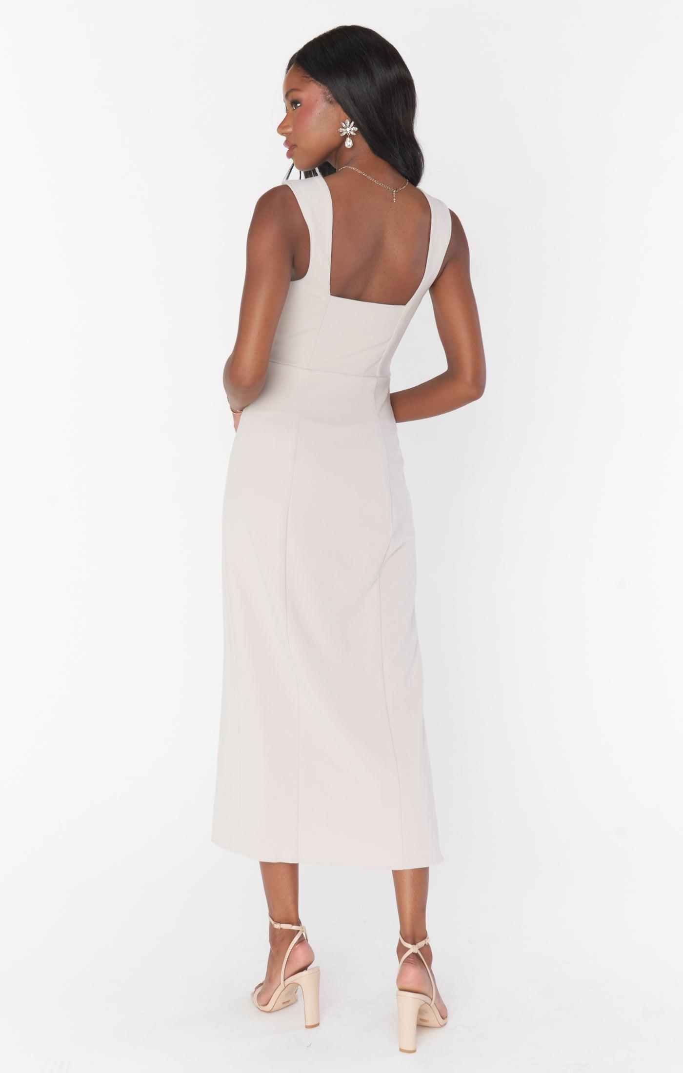 This fitted midi dress is as flattering as it is comfortable. Neutral-hued stretchy fabric holds in all the right places, punctuated with a side slit. The square neck is complemented with a thicker strap to ensure you feel secure no matter where you wear her! *sash sold separately