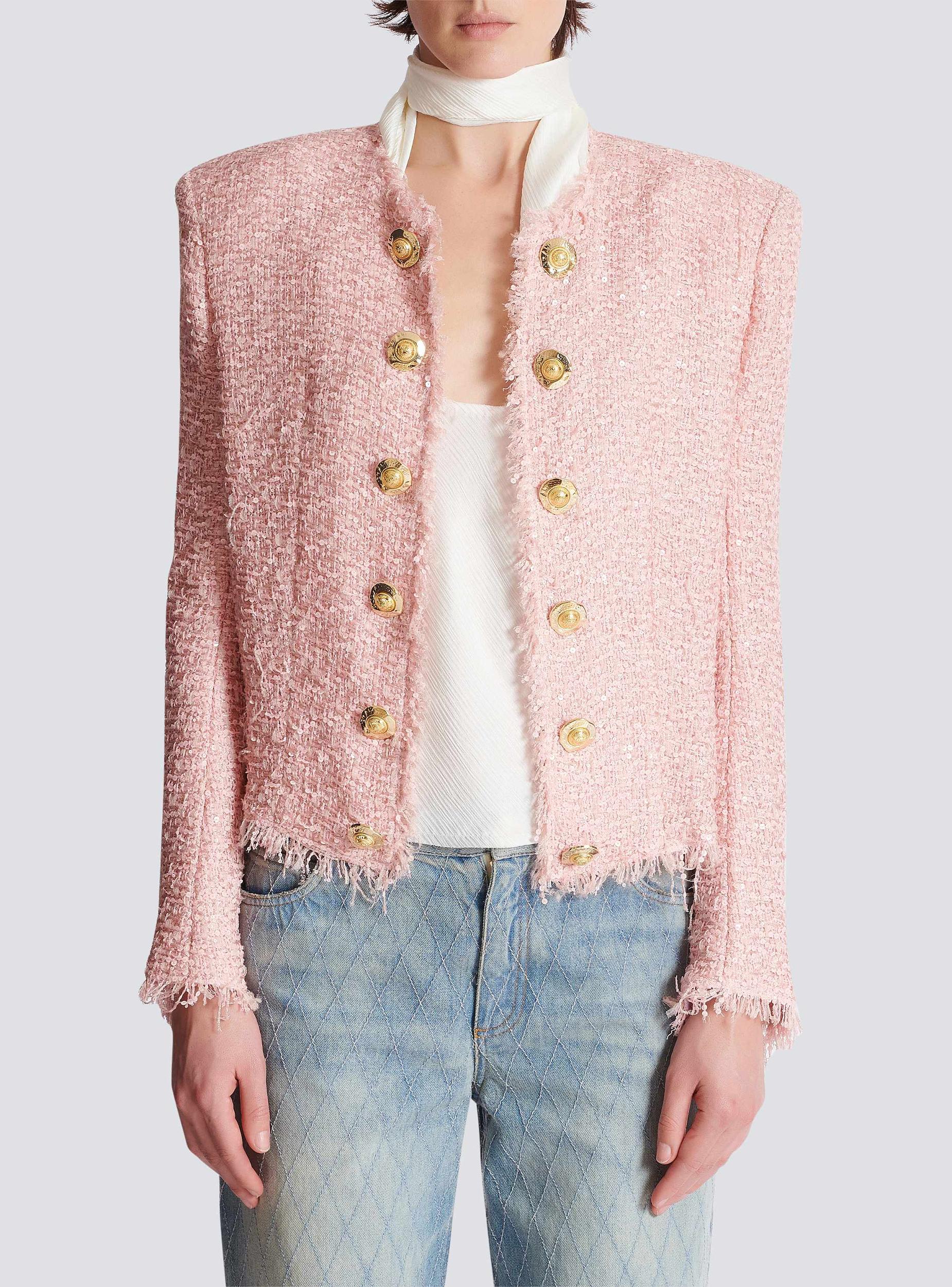 Relaxed edge-to-edge jacket in sequin tweedRound necklineStructured shouldersLong sleevesStraight cuffs with 5 golden metal ‘Coin’ buttons12 metal ‘Gold and Gold Coin’ decorative buttons on the frontRaw hemsTwill liningStraight cutModel measures 178cm and wears a size 36Main material: 71% polyester 13% viscose 9% polyamide 7% metallic polyesterMade in PolandItem: FF1SM508XL01