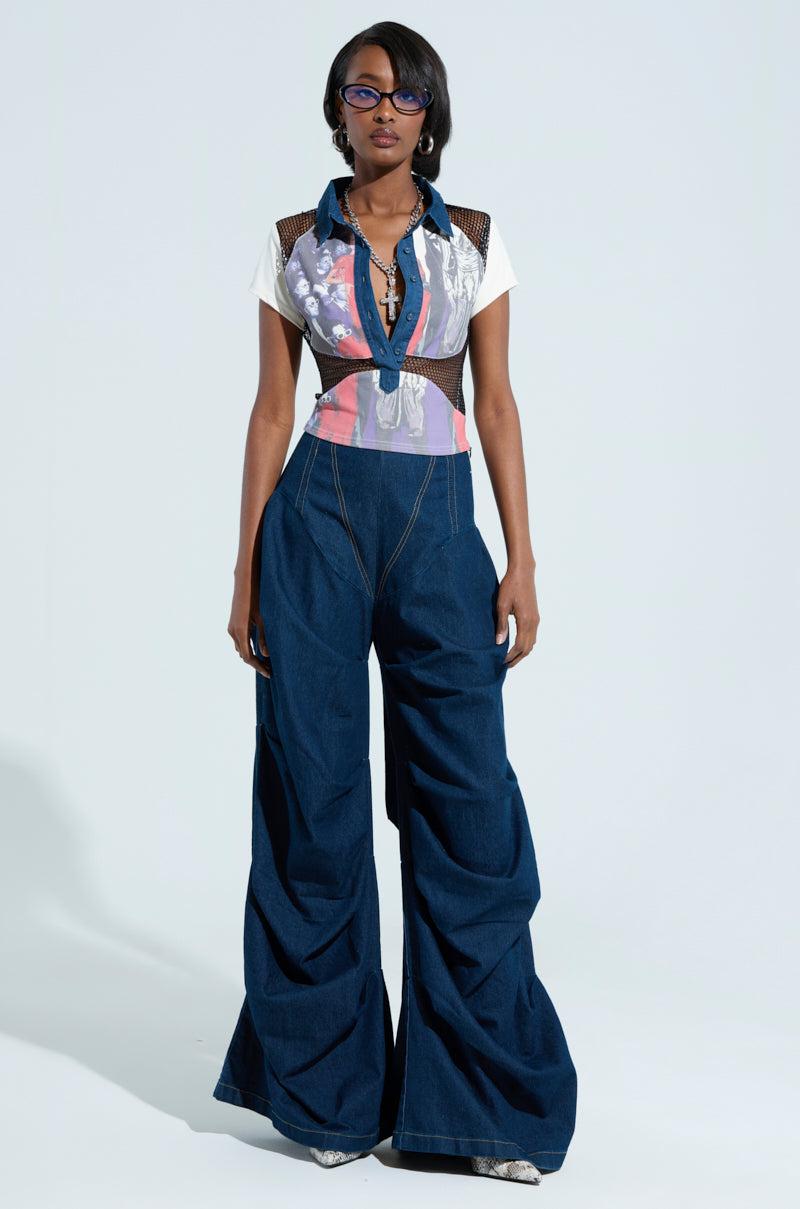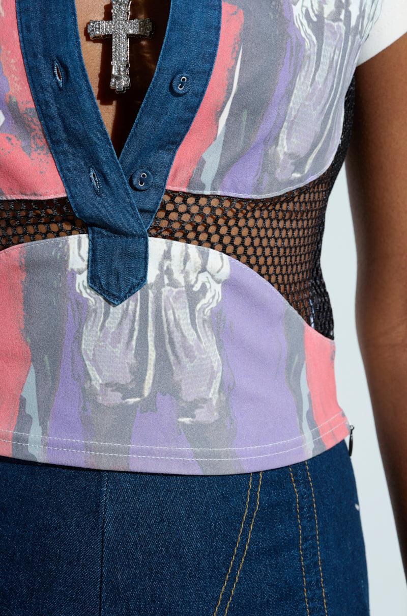 The AKIRA Label Edgy Diva Short Sleeve Netted Tshirt is crafted from a stretchy, unlined fishnet mesh base and features a denim pointed collar, contrast short sleeves made of an opaque fabric, a circular panel on the center of the bodice that showcases a retro print of a woman, a coordinating retro panel on the bottom hem, and a denim front placket with denim button down closures. Complete with a fitted, waist-length silhouette. Pair with a leather mini skirt, platform moto boots, and a leather shoulder bag for a finished look. - Main: 80% Polyester 20% Spandex, Trim: 100% Polyester- Hand Wash Cold- Some Stretch- Imported (all measurements approximate from size small)- 17” Shoulder to Hem- 4.5” Sleeves- 14” Shoulder to Shoulder- Model is 5’8” and is wearing size smallProduct ID: 464342 (all measurements approximate from size 1X)- 21” Shoulder to Hem- 6” Sleeves- 16” Shoulder to ShoulderProduct ID: 464346