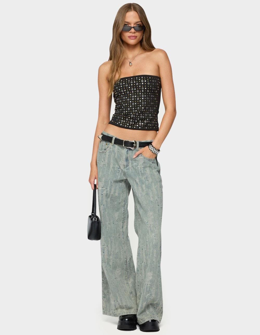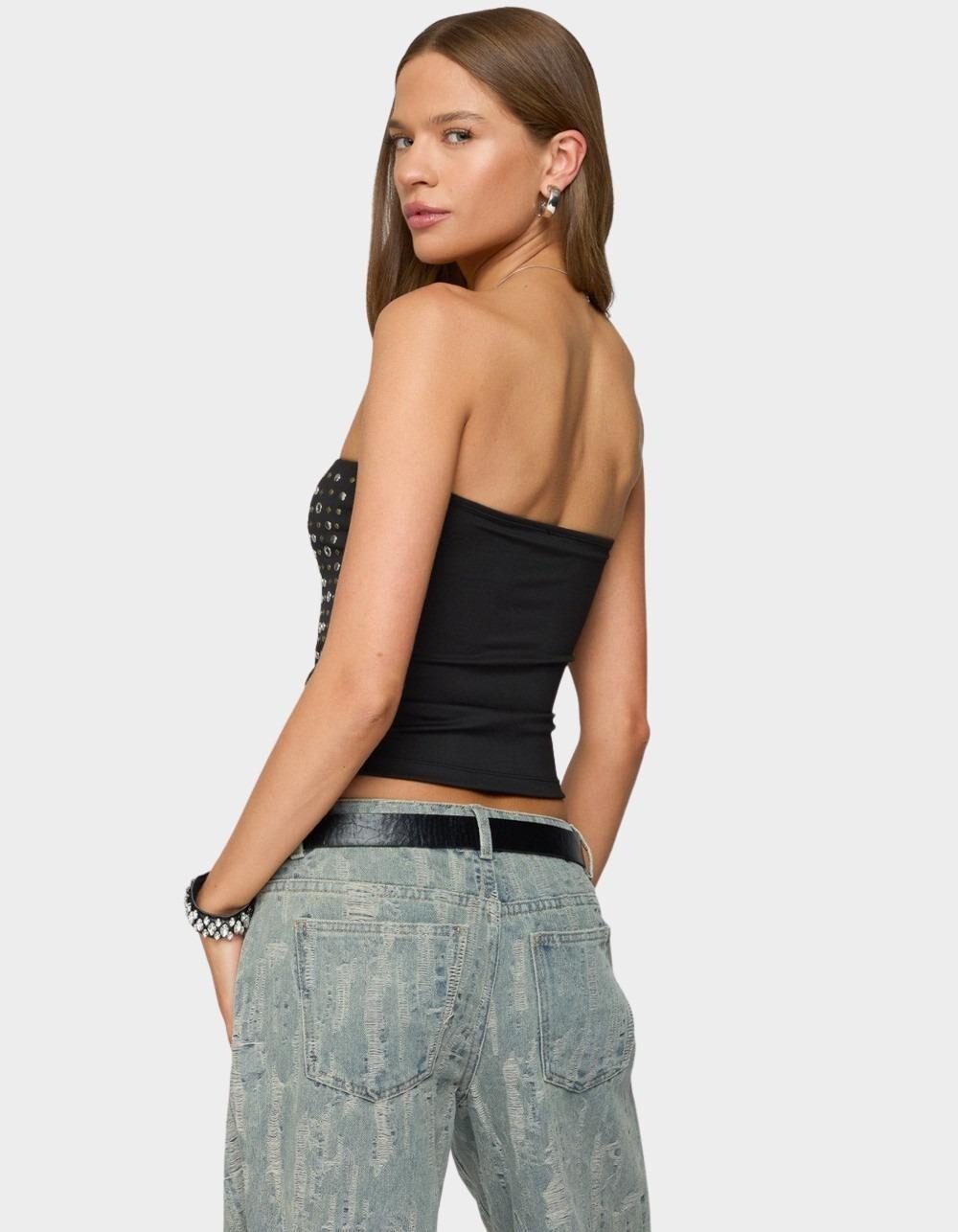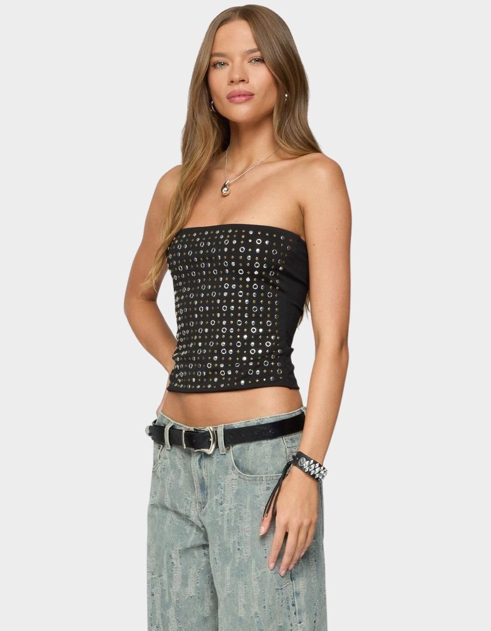 This studded grommet tube top is the perfect choice for a night out with the girls. Pair it with a cute mini skirt for the perfect look. Tube top. Studded grommet detailing. 80% Polyester, 20% Spandex. Model wears size S. Item care: hand wash at maximum of 30ºc, do not bleach, do not tumble dry, iron at a maximum of 110ºc, iron inside out, do not dry clean.This item is may take a few extra days to process. All other products in your order will be shipped separately.