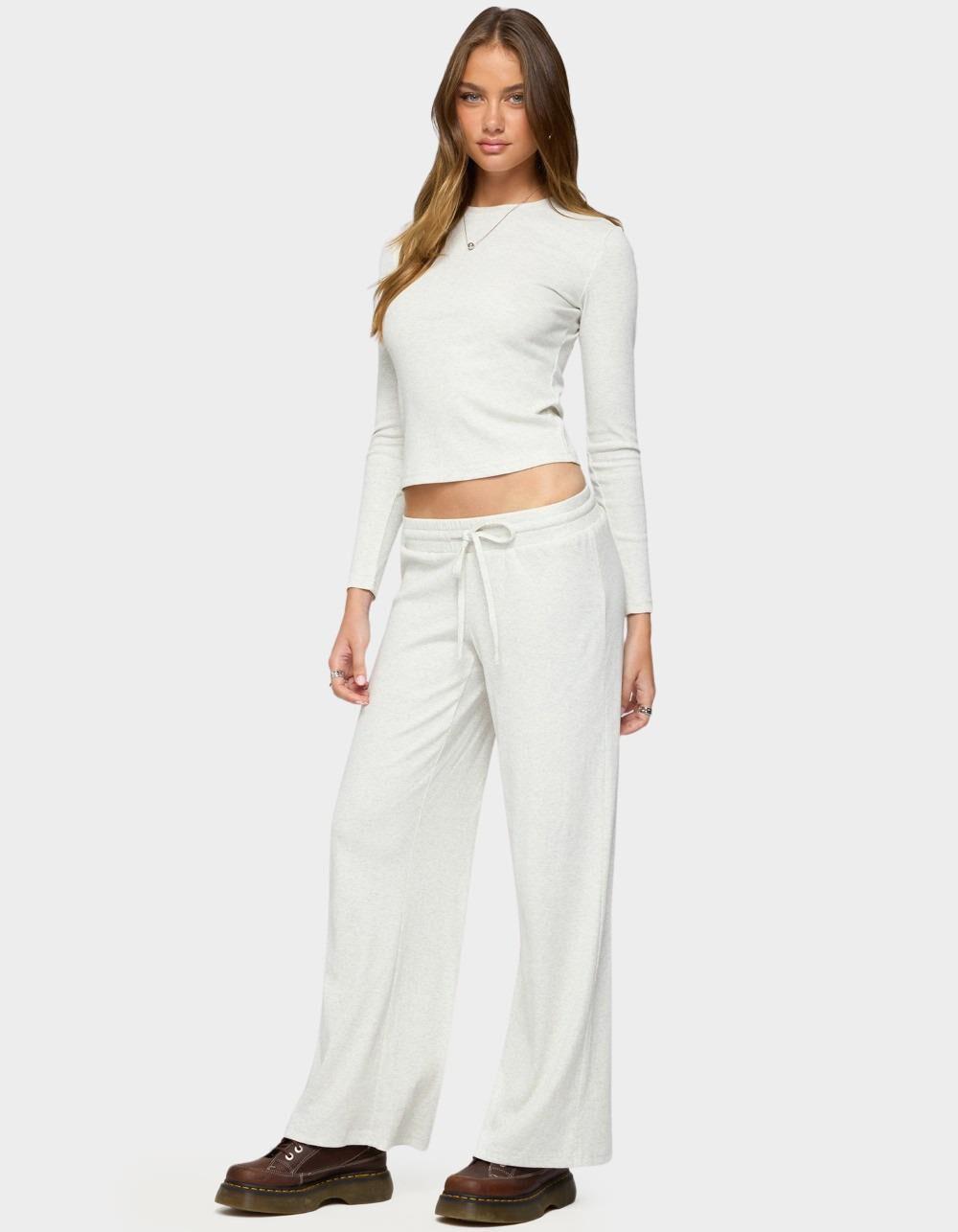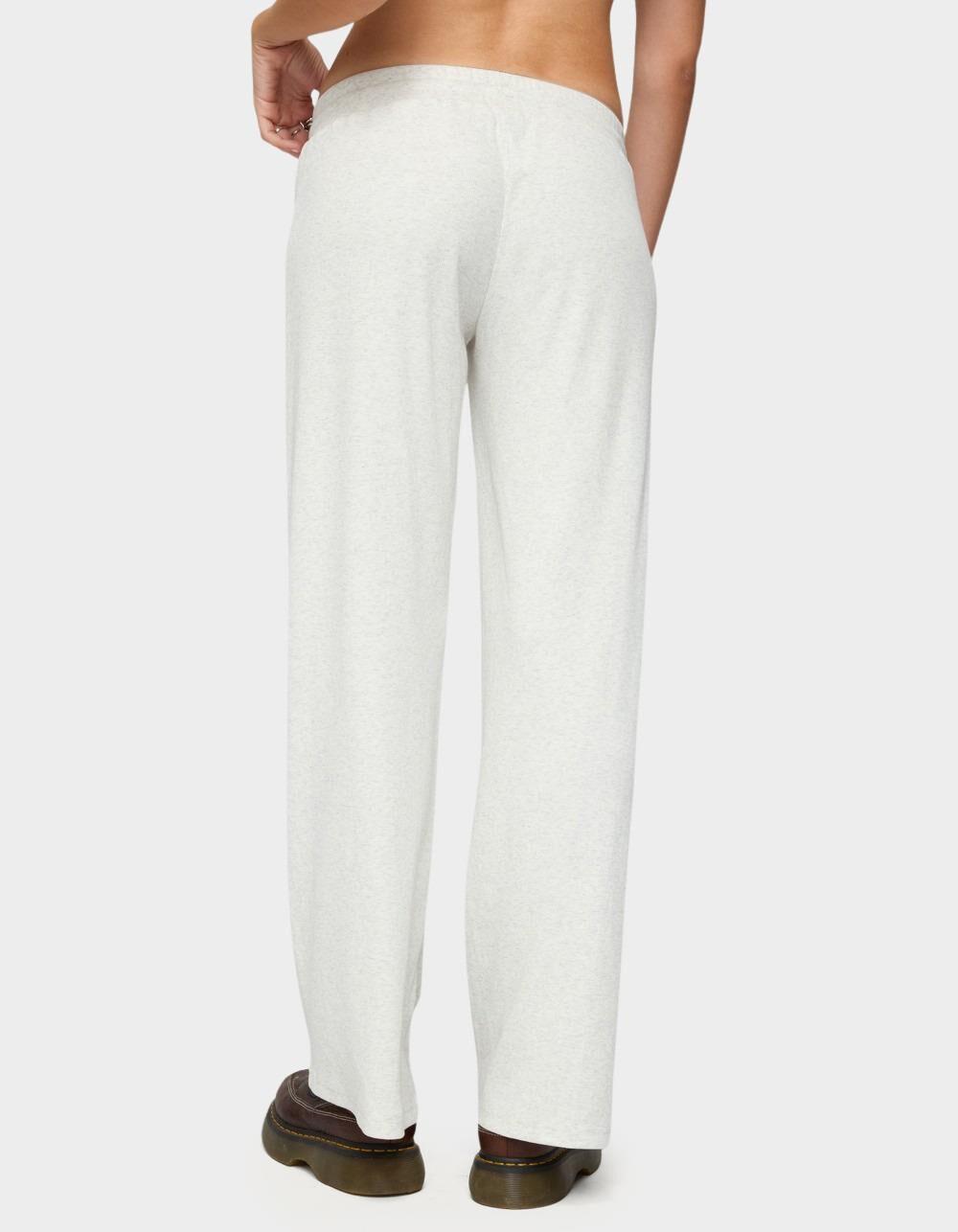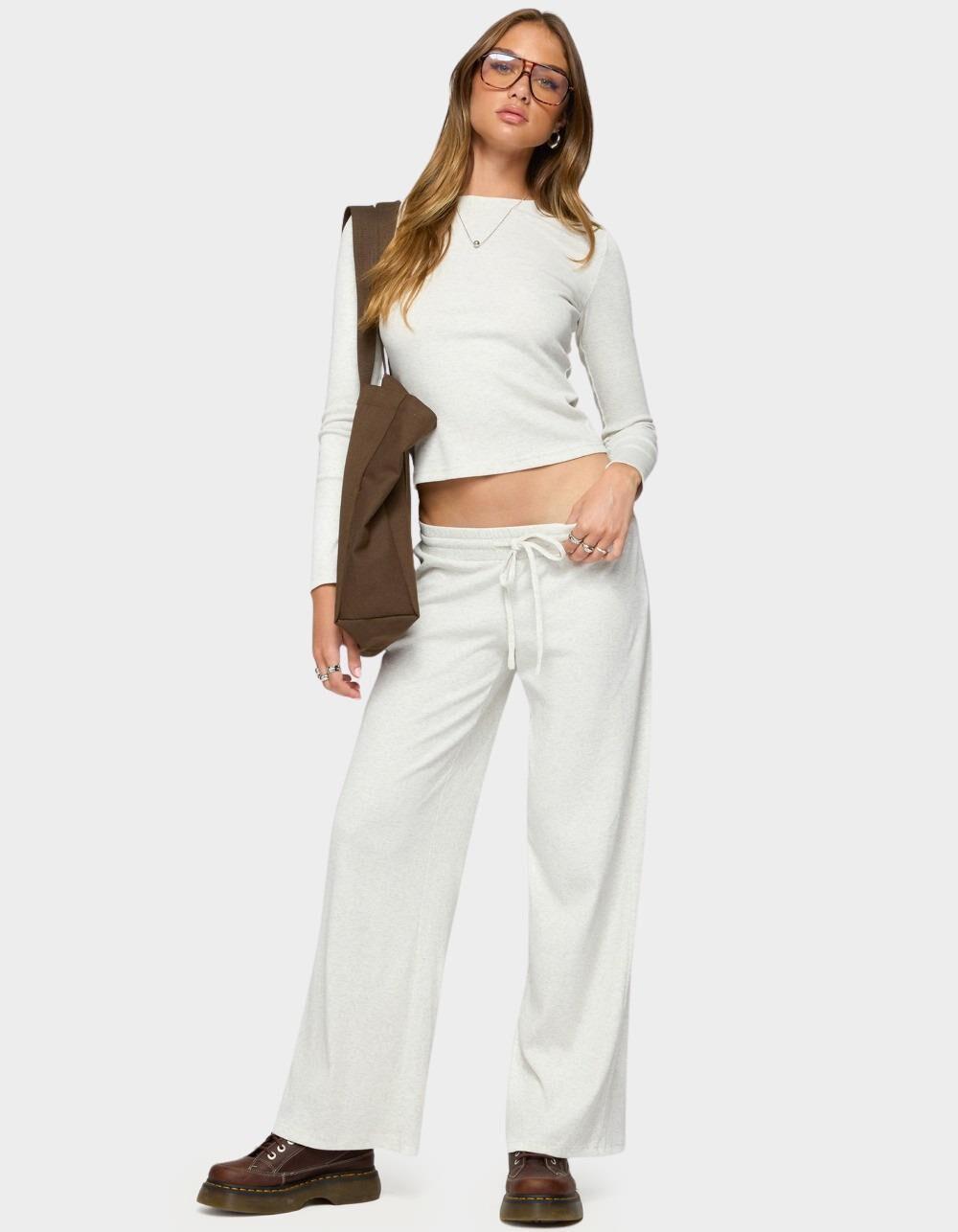 No closet is ever complete without the perfect throw on pants. With a comfortable ribbed fabric, these pants will become a staple in your wardrobe. Loungewear pants. Straight leg fit. Adjustable tie waist. Ribbed fabric. Matching set. 78% Cotton, 20% Polyester, 2% Spandex. Model wears size S. Inseam of size S (in): 31.89. Model height is 5'10. Item care: machine wash at maximum 30ºc, wash with similar colors, do not bleach, do not tumble dry, iron at a maximum of 110ºc, do not dry clean.This item is may take a few extra days to process. All other products in your order will be shipped separately.