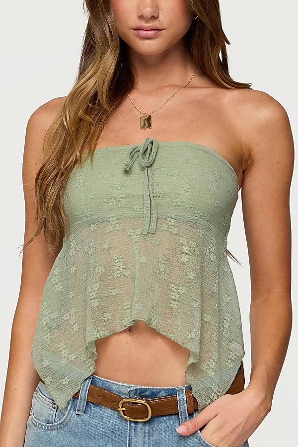 Whether you want to wear this top with a cute mini skirt or style it with your favorite pair of jeans, the sheer embroidered fabric is perfect for adding a touch of feminity to any outfit. Features Asymmetric hem Strapless fit Lined bust Front tie detail Sheer embroidered fabric Content + Care Polyester, Spandex Machine wash Imported Size + Fit Model wears size S, Model height is 58 Edikted Embroidered Sheer Strapless Top in Navy, Womens at Urban Outfitters