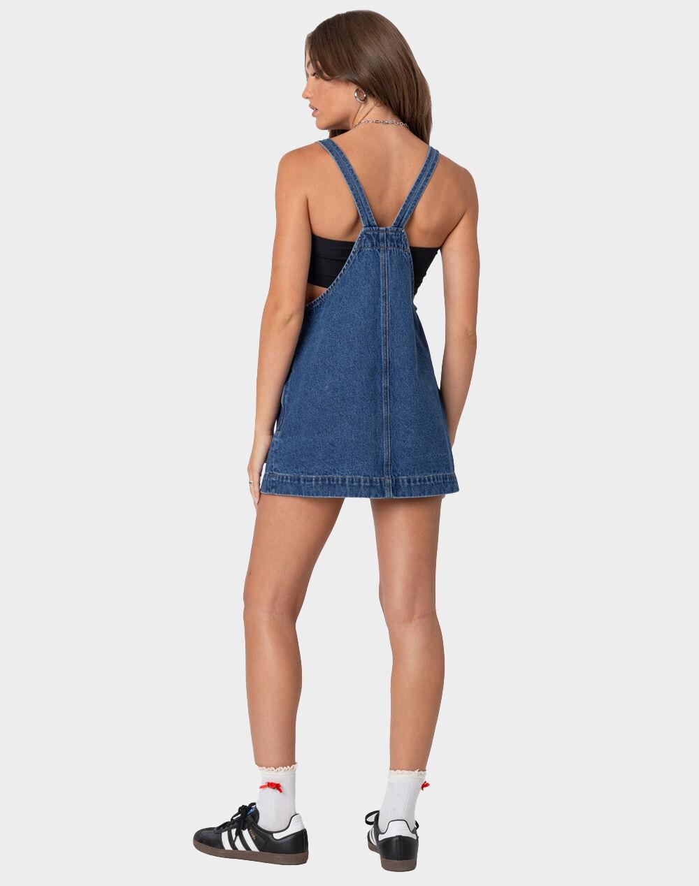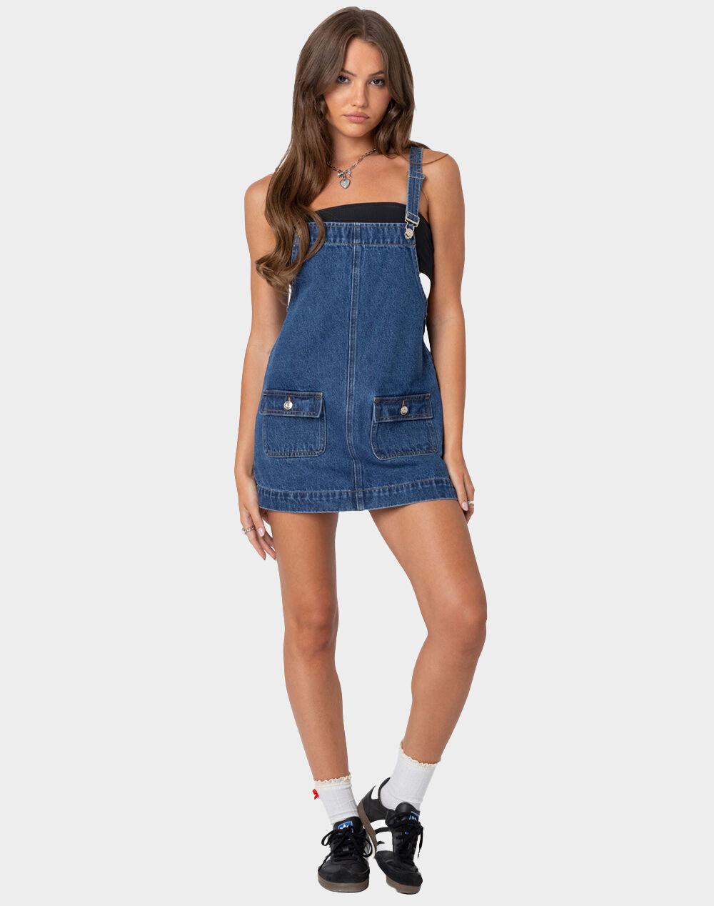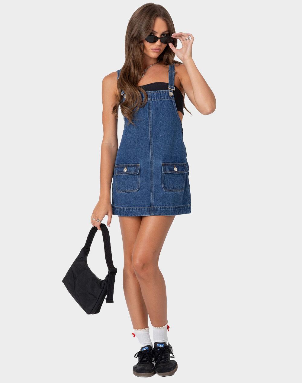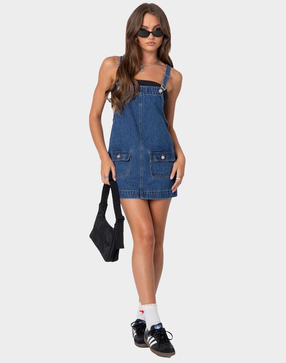 The denim craze continues with this overall style mini dress. These dress is effortlessly casual with a relaxed fit for that cool girl feel. Mini dress. Adjustable straps. Overall style. Pockets. Denim fabric. 100% Cotton. Model wears size S. Model height is 5'8. Item care: machine wash at maximum of 30ºc, do not bleach, tumble dry low, iron at a maximum of 110ºc, do not dry clean.