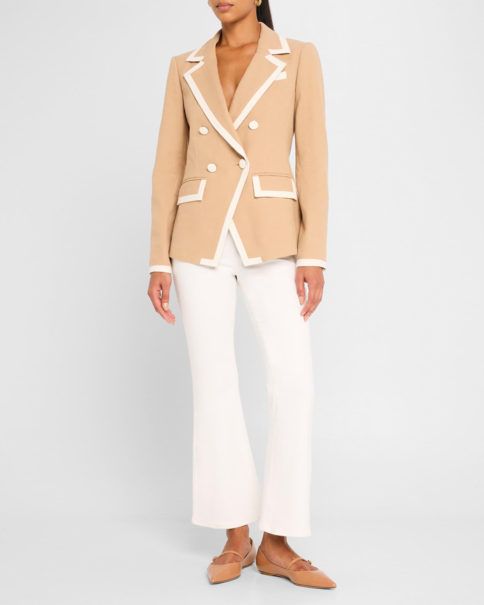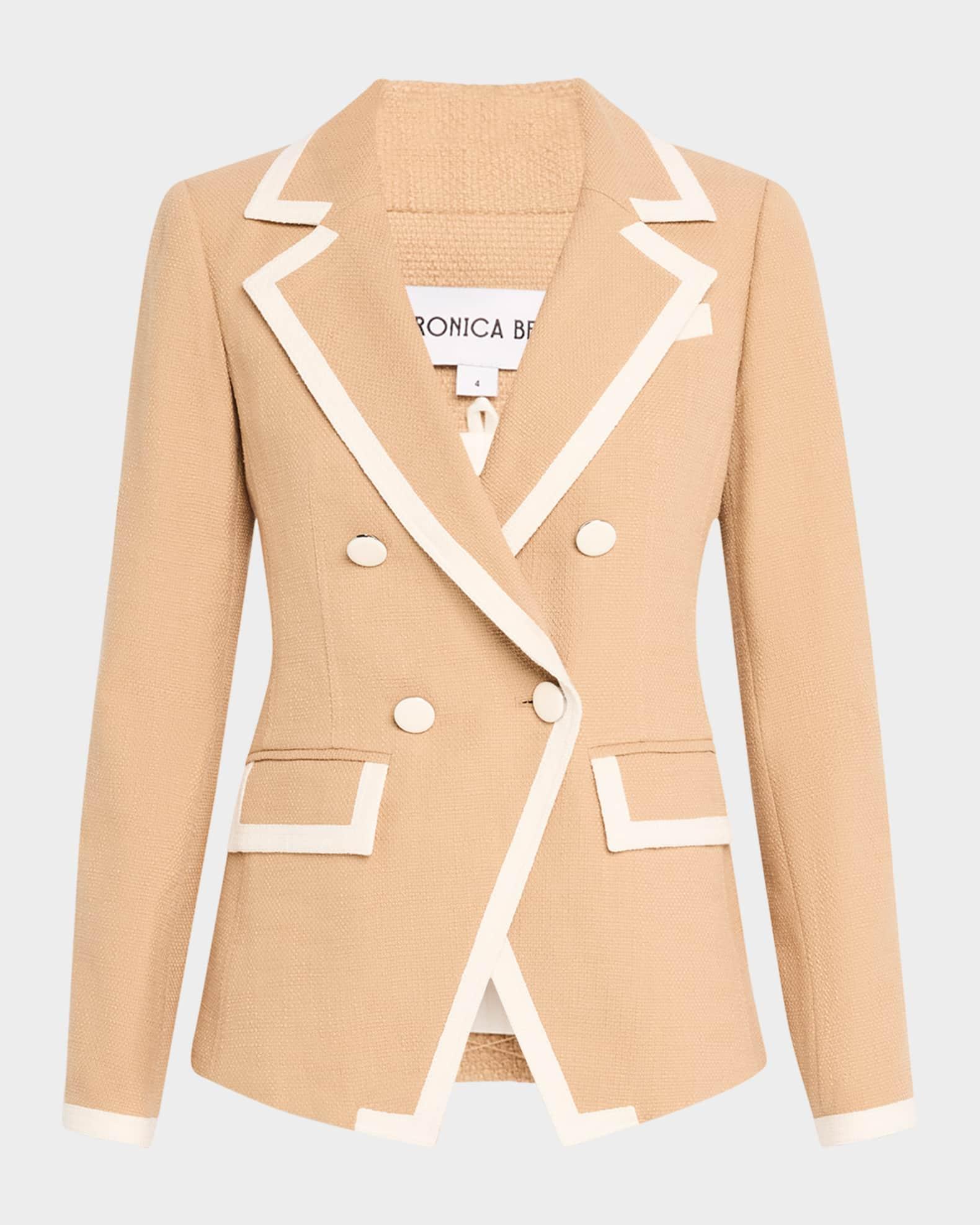 Veronica Beard "Edison" dickey jacket with contrast trim Compatible with Veronica Beard dickey's (sold separately) Notch lapels Double-breasted front Long sleeves with button cuffs; approx. 32.5"L Chest welt pocket Hip flap pockets Tailored fit Cut-away hem Button-front Cotton/polyester/Promodal® rayon Lining: Polyester Dry clean Imported Model is 5'10"/177cm.