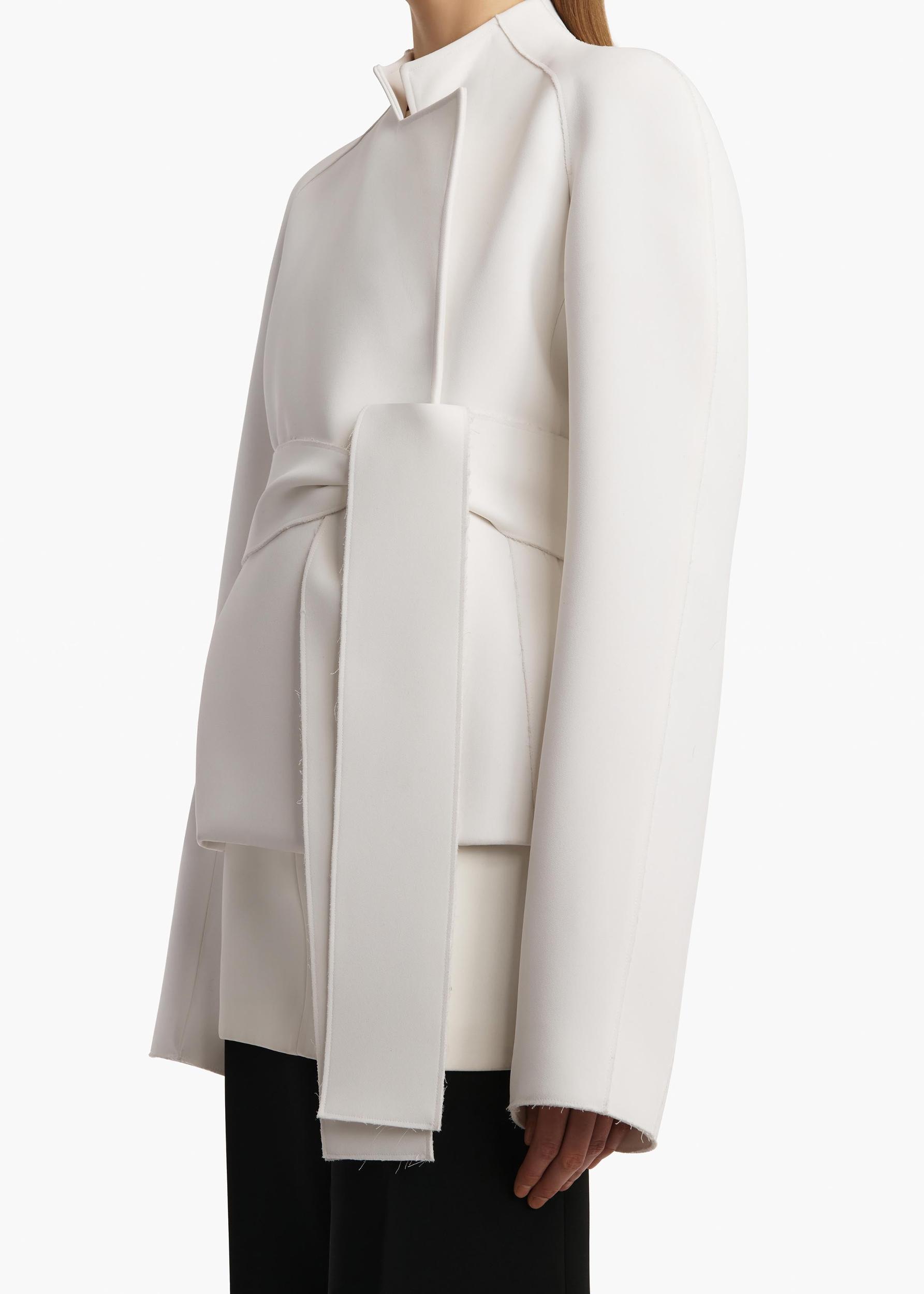 A raglan-sleeved wrap silhouette in double-faced crepe. Strengthened by decisive lines, lapped seams, and refined shoulder pads. Cinch with the wide, scarf-like sash belt or wear open.