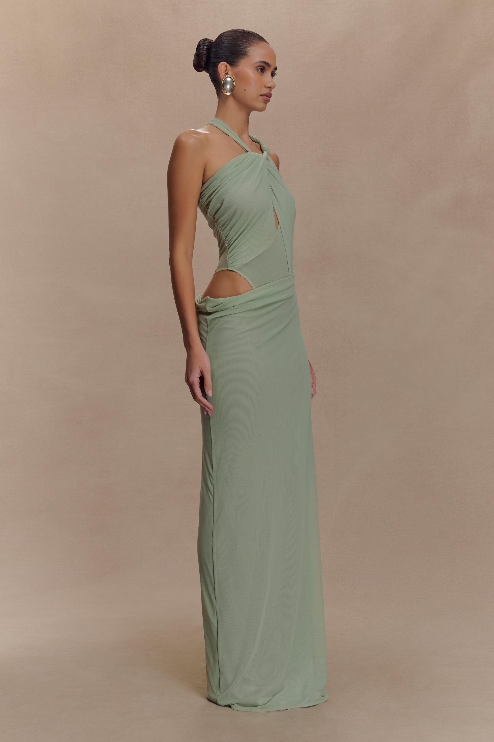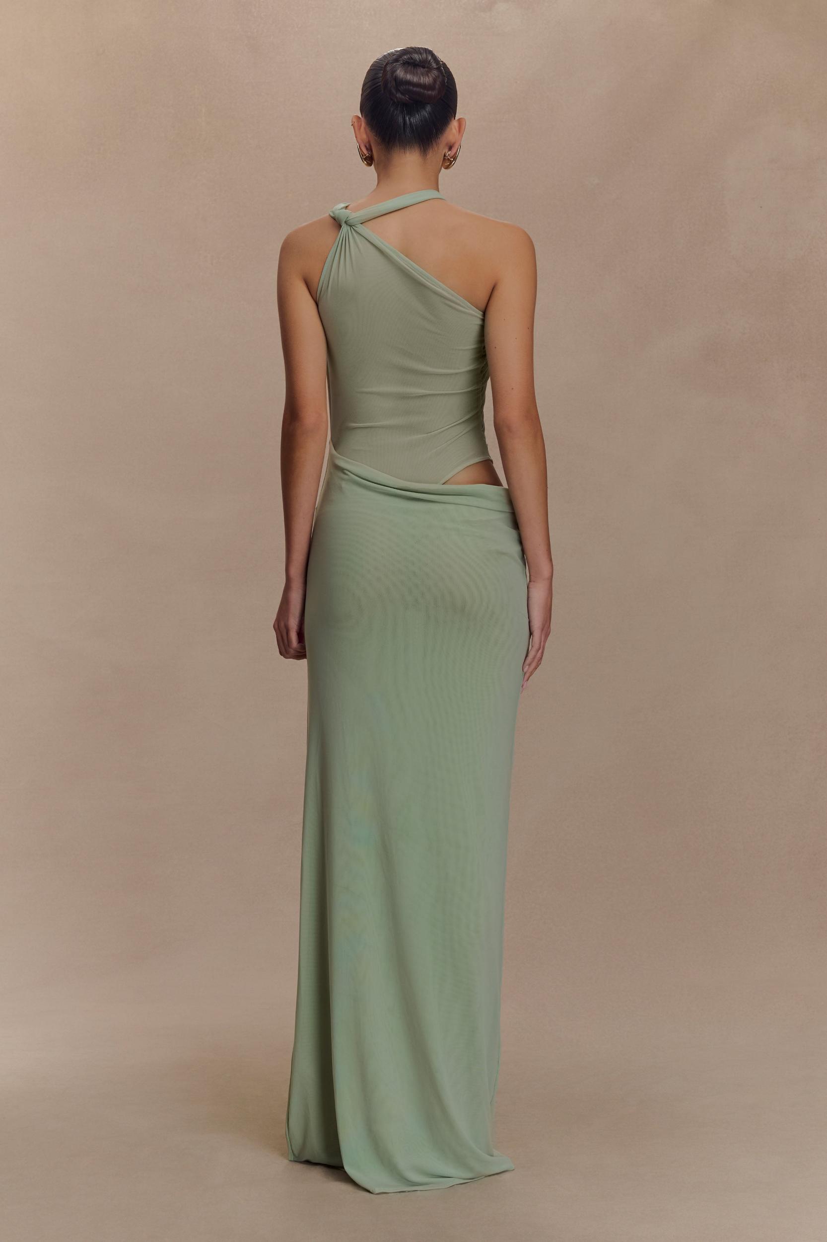 Knotted to captivate. The EDWINA Knotted Mesh Maxi Dress is a striking blend of fluidity and form. Designed with a twisted neckline and knot details at both the front and back shoulder, this dress creates an effortlessly sculptural silhouette. The mesh bodysuit base offers a sleek, figure-hugging fit, while the overlay skirt drapes from the waist with a gathered front panel that adds texture and movement. Crafted from double-layered mesh for a soft, dimensional finish, this dress is made to turn heads—perfect for after-dark events or elevated occasions.