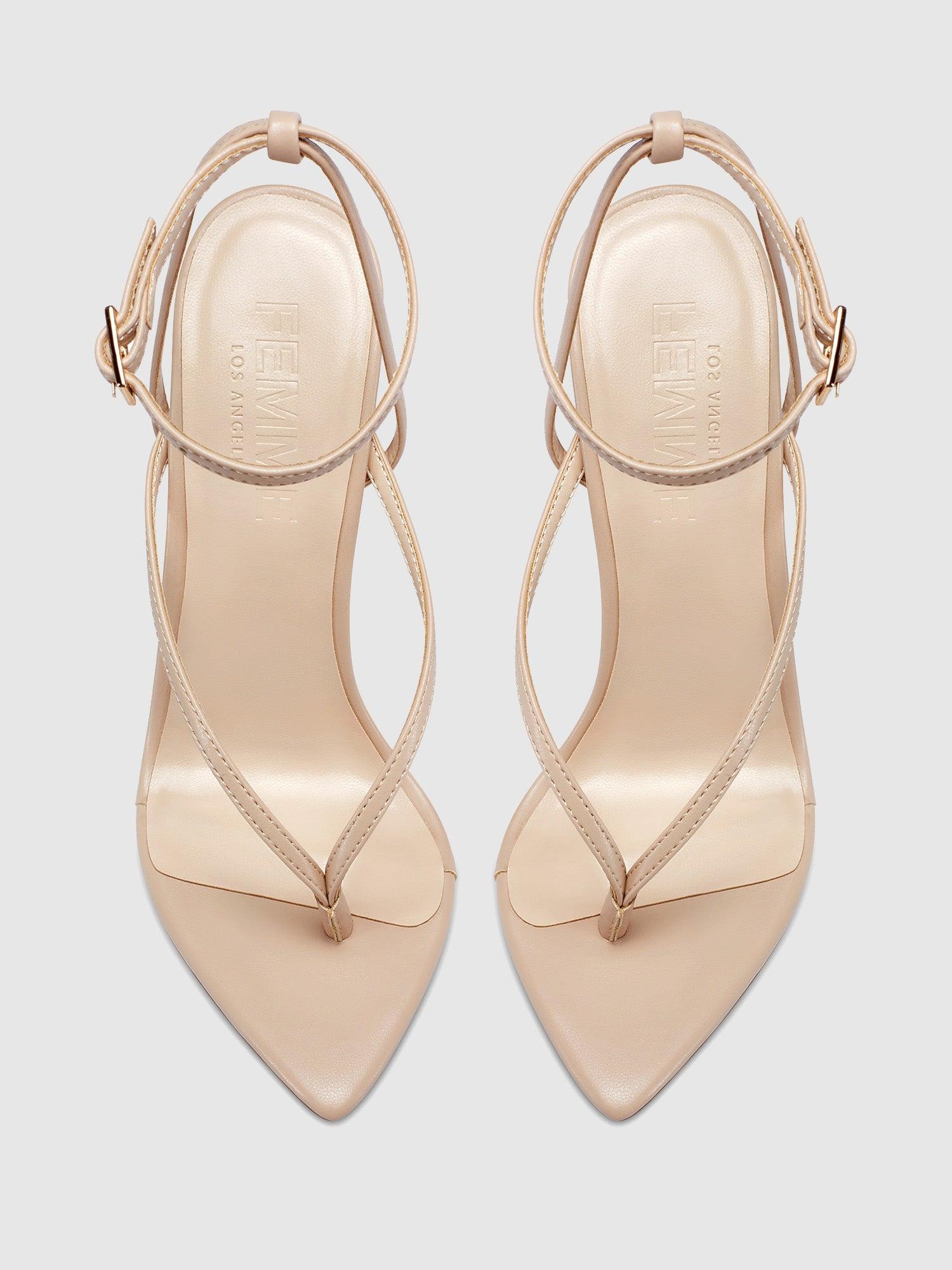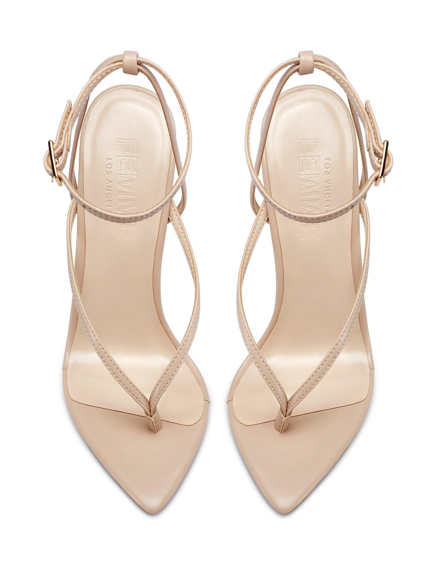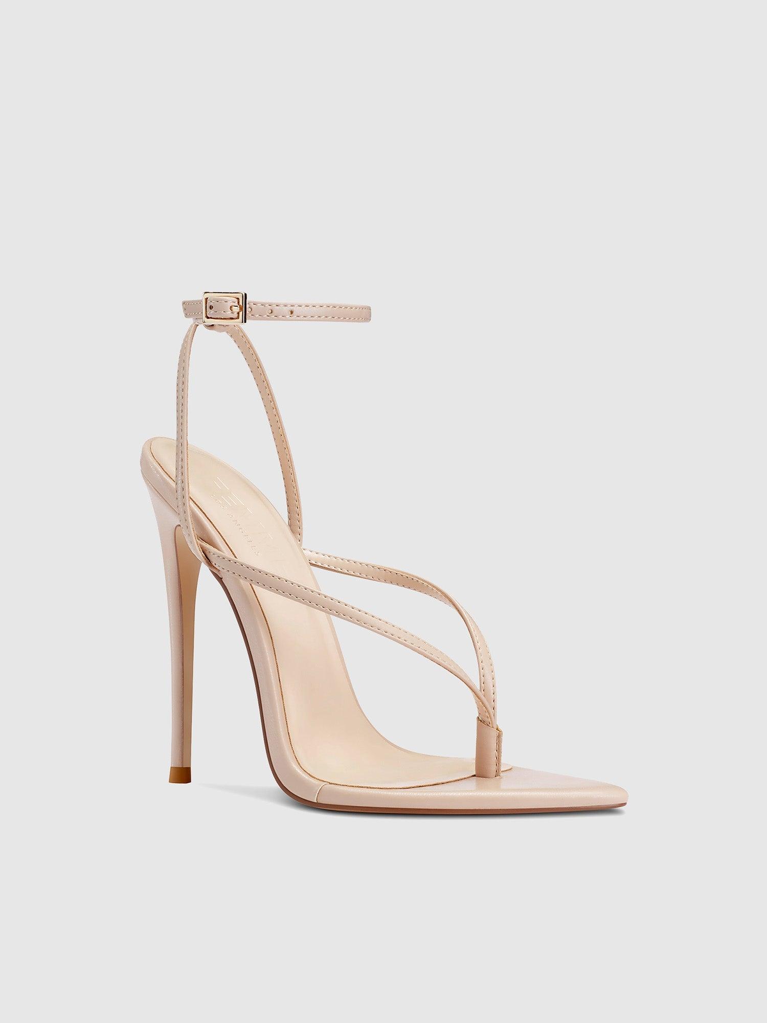 The Effie Sandal features a thong strap design and exaggerated pointed toe for a sleek, barely-there look. With its high stiletto heel and minimalist silhouette, it is the perfect choice to elevate any outfit. Vegan upper Vegan insole Vegan outsole Open pointed toe Adjustable ankle strap Handmade Designed in LA Self-covered stiletto heel, 4.75" (120mm)