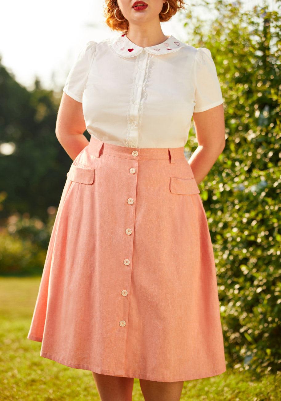 This peachy pink midi skirt from our ModCloth namesake label is an easy pairing for feminine blouses, retro graphic tees, and just about any other separate you’re in the mood to wear. A high waist with belt loops, handy pockets with decorative flaps and playful pleats create the stylish simplicity of this linen-blended piece. Featuring full front button closure and finishing below the knee with a darling A-line silhouette, this effortless-yet-elevated skirt is a go-to favorite in our collection because it can be styled to compliment any aesthetic. 55% Linen, 45% Cotton Fabric does not provide stretch. Front patch pockets with flap closure. Full front button closure. Machine wash cold, delicate cycle, lay flat to dry. Imported.