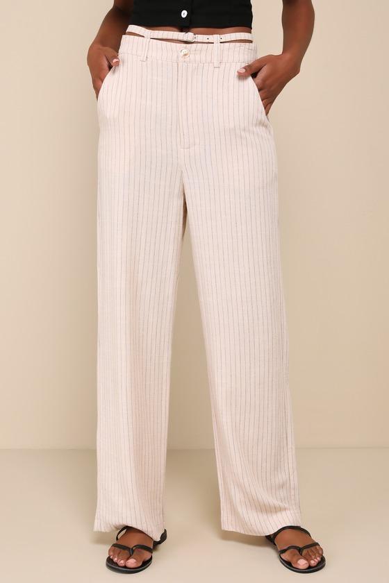 Level up your style this season with the Lulus Effortless Time Beige Striped Linen High-Rise Wide-Leg Pants! Lightweight linen-blend woven fabric (with a striped pattern throughout) shapes these chic pants that have a high waist, belt loops, and a hidden zip fly with top button closure. Bonus skinny belt threads along the top, creating a cutout effect. Wide legs have front diagonal pockets (and decorative back welt pockets) and fall to ankle length hems.