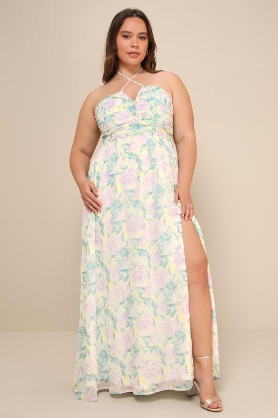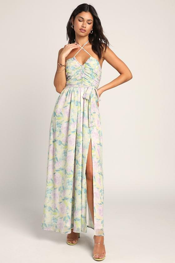 The Lulus Effortlessly Abloom Green Multi Floral Ruched Halter Maxi Dress is a recipe for instant elegance, no matter the occasion! Lightweight woven chiffon, with a subtle, romantic floral print throughout, shapes this essential event dress. Slender trying spaghetti straps form a halter as they cross to support a ruched bodice with a V-neckline (and hidden no-slip strips). A sash belt wraps the waist, atop a skirt that falls to a midi hem with an alluring side slit. Hidden zipper/clasp at side.