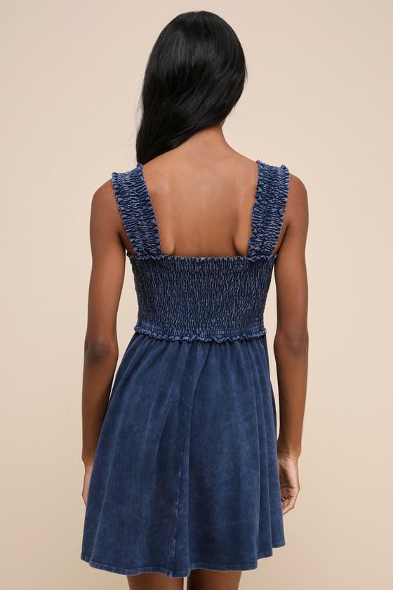From casual BBQ days with the family to brunch with the babes, the Lulus Effortlessly Lovely Washed Navy Blue Smocked Mini Dress is the perfect go-to pick! Stretchy, cotton-blend jersey knit (with a washed effect throughout) shapes this too-cute dress with wide, smocked straps and a matching smocked bodice, all adorned with ruffled trim. A high, fitted waist creates a babydoll effect atop the classic A-line mini skirt.