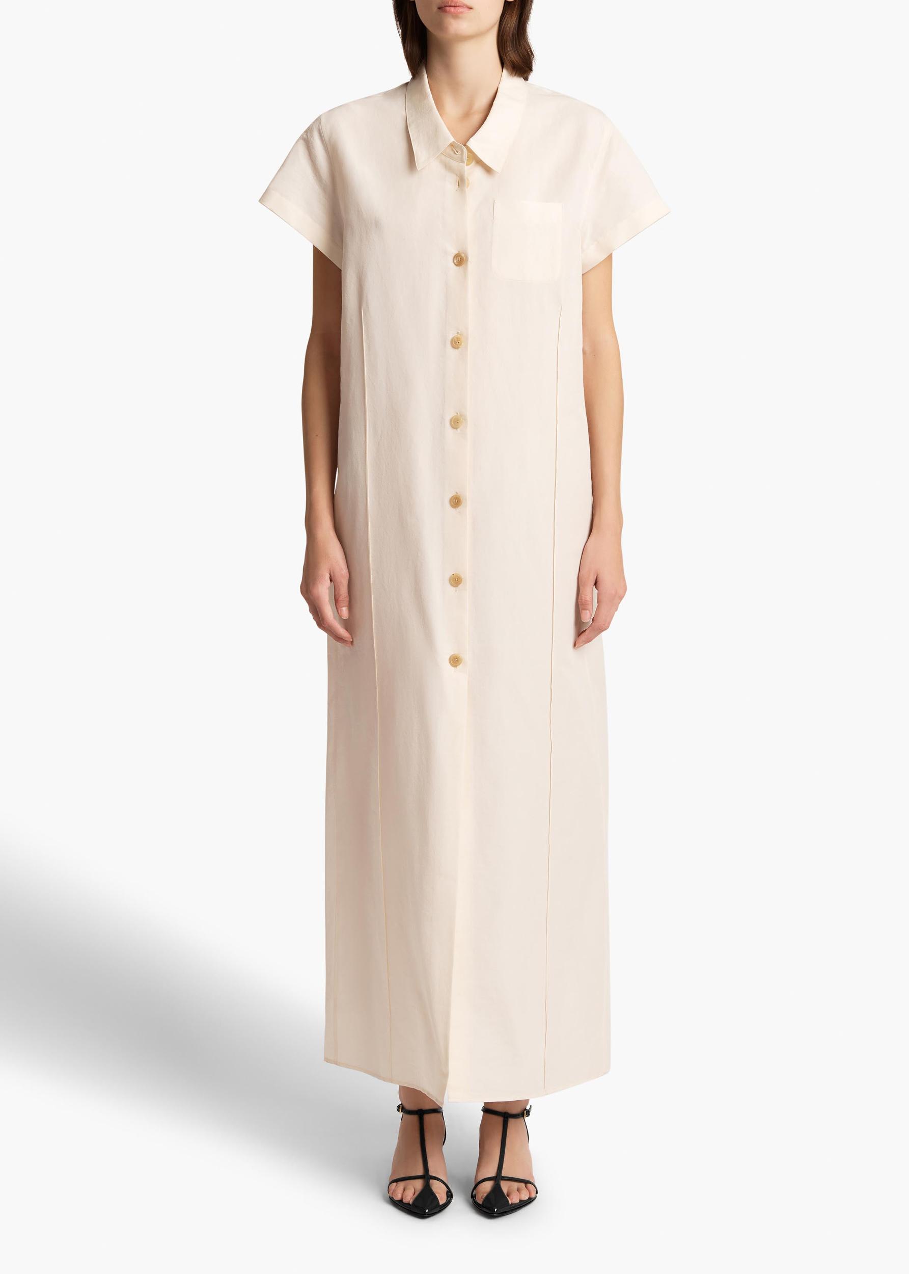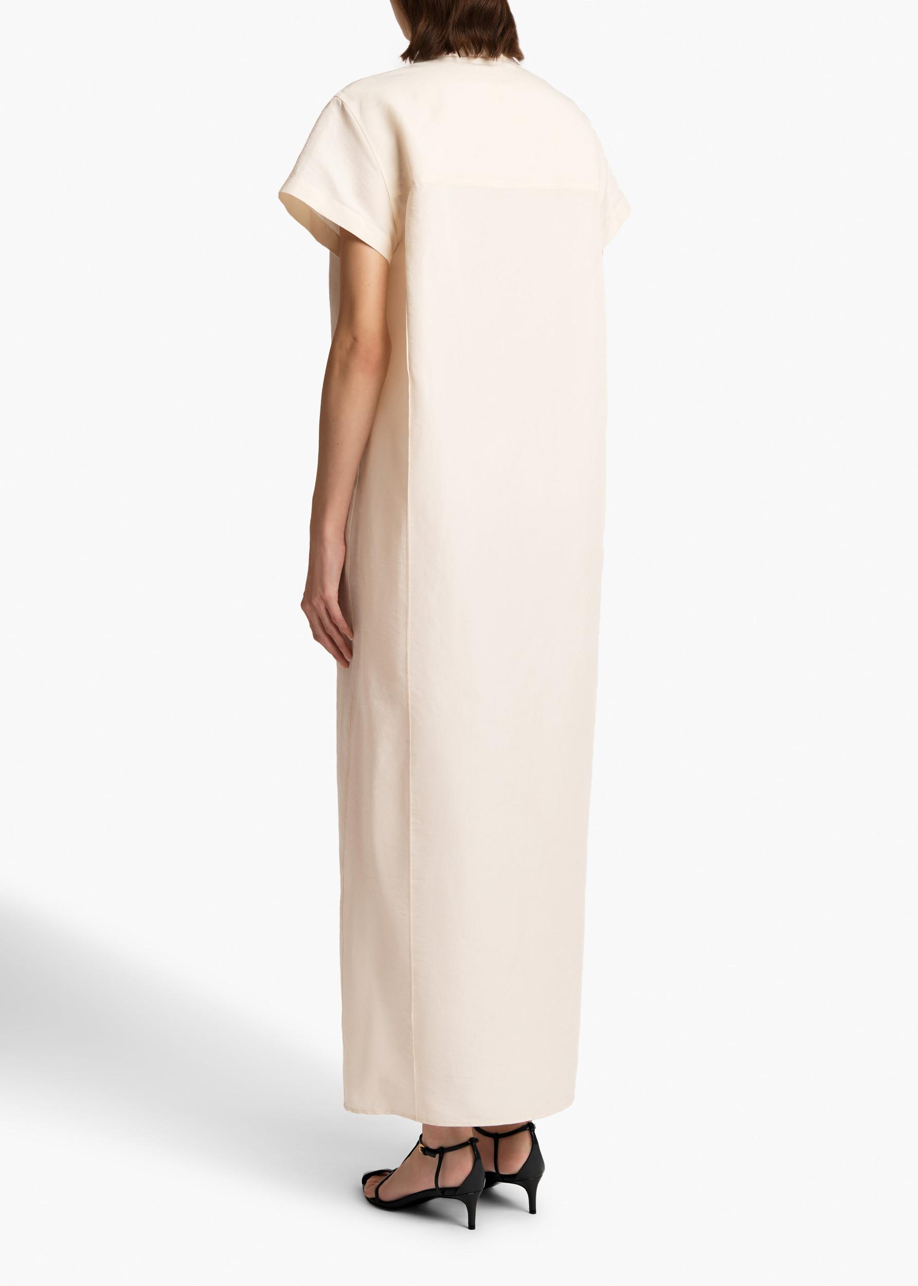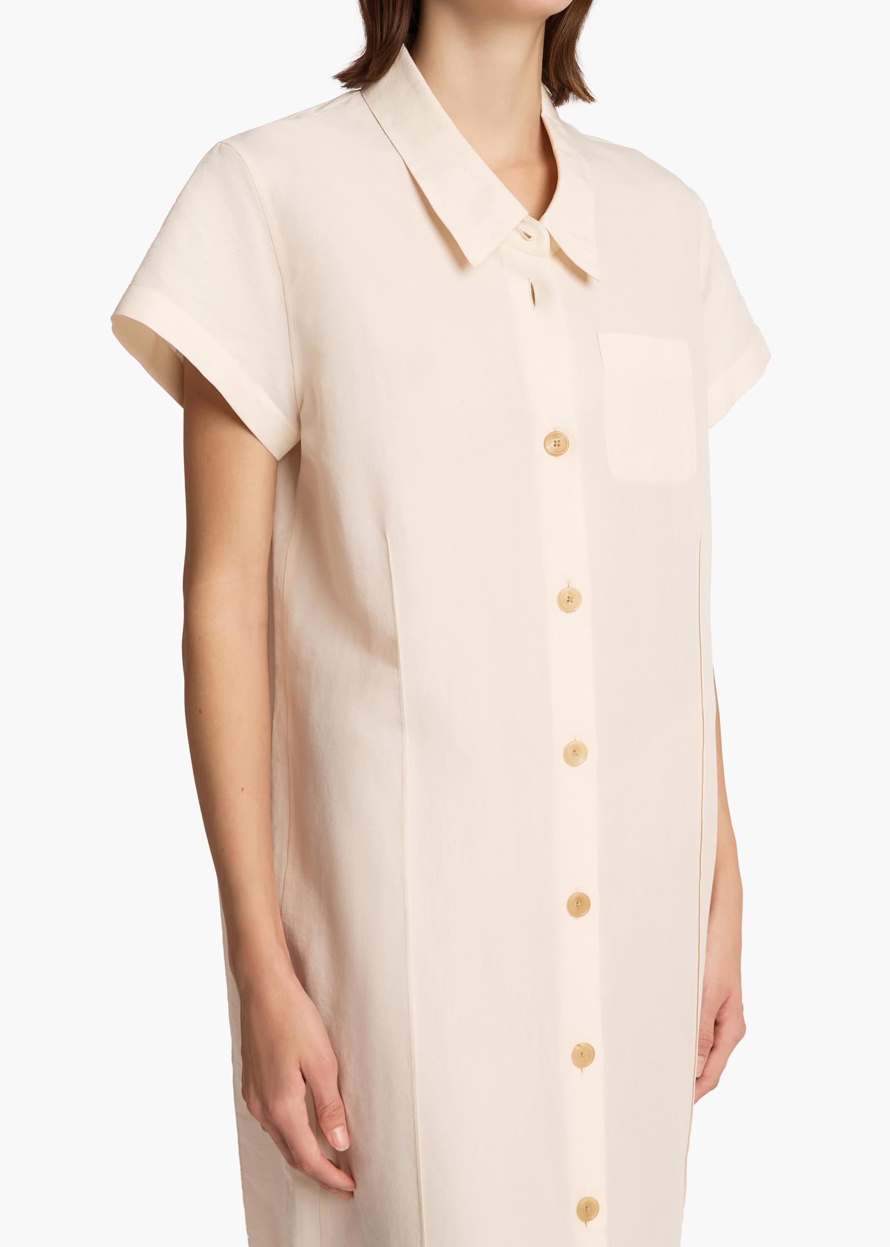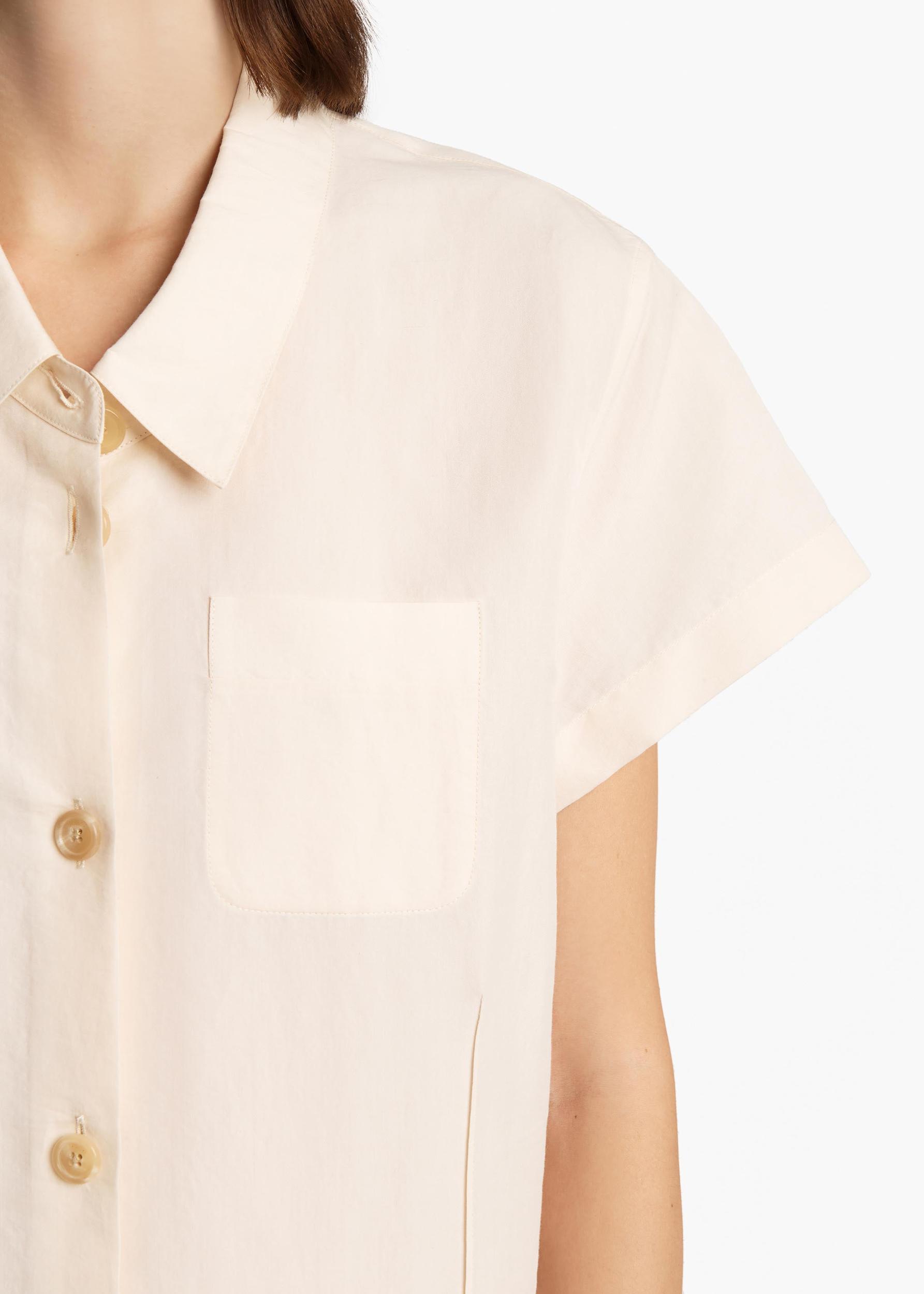 A short-sleeved shirtdress in crisp, fluid organza. Pintucks at front and back create a refined cocoon shape. With back yoke and welt pocket at chest.