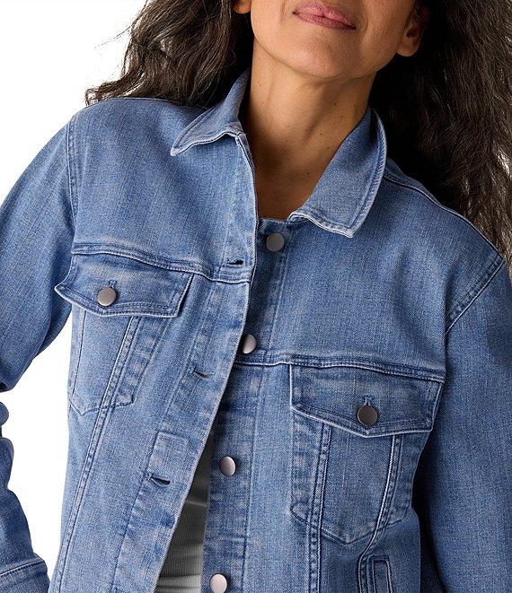 From Eileen Fisher, this jacket features: Denim fabrication Point collar neckline Long sleeves with button cuffs Front flap patch pockets Straight hem Button front closure Approx. 25" length Organic cotton/recycled cotton/elastane Machine wash Imported.
