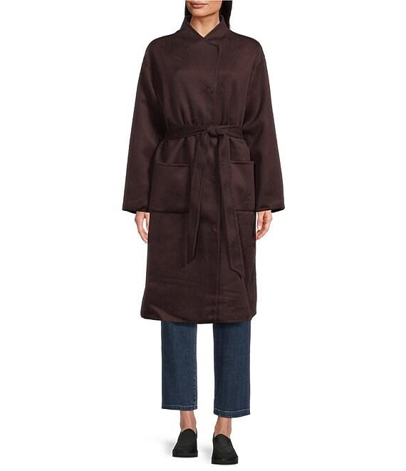 From Eileen Fisher, this coat features: Fluid wool knit fabrication High collar neckline Long sleeves Front patch pockets Straight hem Tie waist closure Approx. 43" length Wool Dry clean Imported.