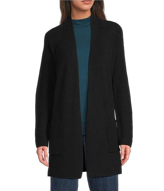 From Eileen Fisher, this cardigan features: Merino wool knit fabrication Open front Long sleeves Patch pockets Straight hem No closure Approx. 29.5" length Wool Hand wash Imported.
