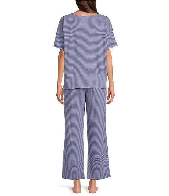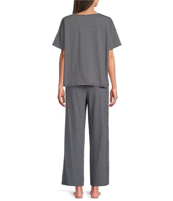 From Eileen Fisher, this pajama set features: Top: Striped print Jersey knit fabrication Round neckline Short sleeves Side slits Pullover construction Approx. 26" length Organic cotton Machine wash cold/tumble dry low Bottom: Matching pant Elastic waistband Pull-on construction Approx. 27.5" inseam Organic cotton Machine wash cold/tumble dry low Imported.