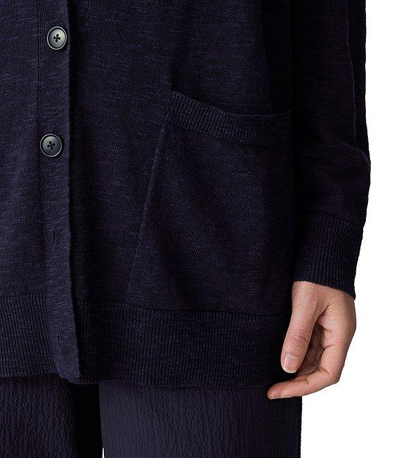 From Eileen Fisher, this cardigan features: Organic linen cotton blend fabrication V-neckline Long sleeves Front patch pocketsStraight hem Button front closureApprox. 29" length Organic linen/organic cotton Machine wash Imported.