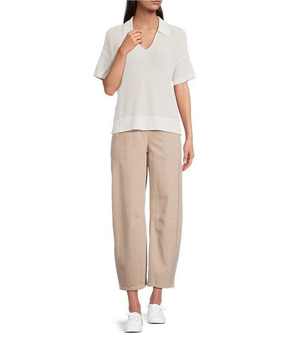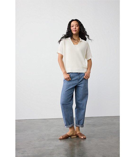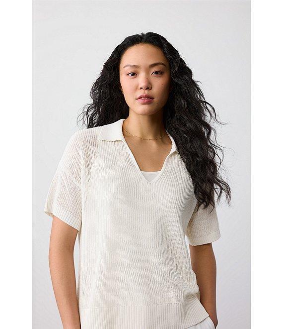 From Eileen Fisher, this top features: Organic cotton blend open weave knit fabrication Henley silhouette Collar v-neckline Short sleeves Straight hem Pullover construction Approx. 23" length Organic cotton/silk fabrication Machine wash Imported.