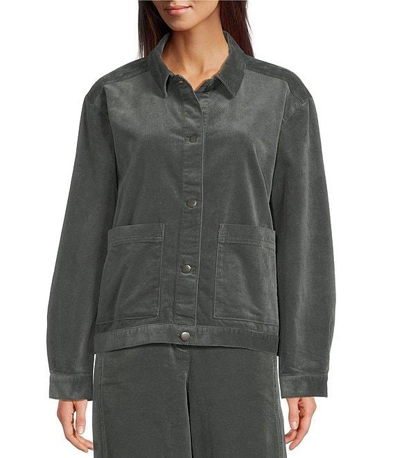 From Eileen Fisher, this jacket features: Stretch corduroy fabrication Point collar neckline Long sleeves Straight hem Button front closure Approx. 24" length Organic cotton/spandex Machine wash Imported.
