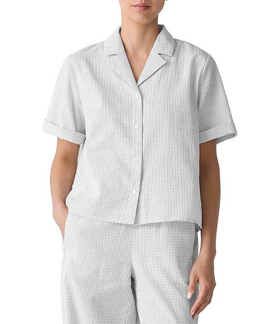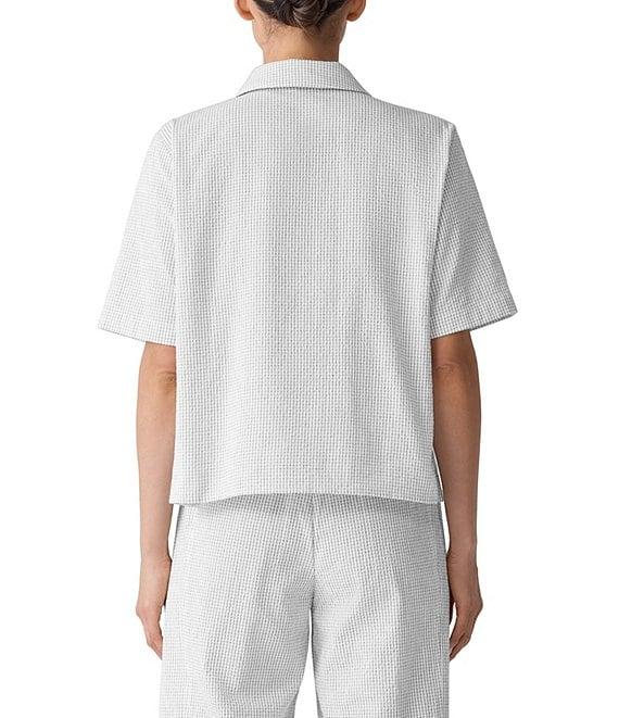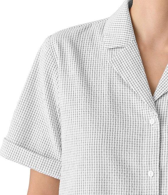 Eileen Fisher Organic Cotton Grid Pattern Notch Collar Short Sleeve Button Front Shirt
