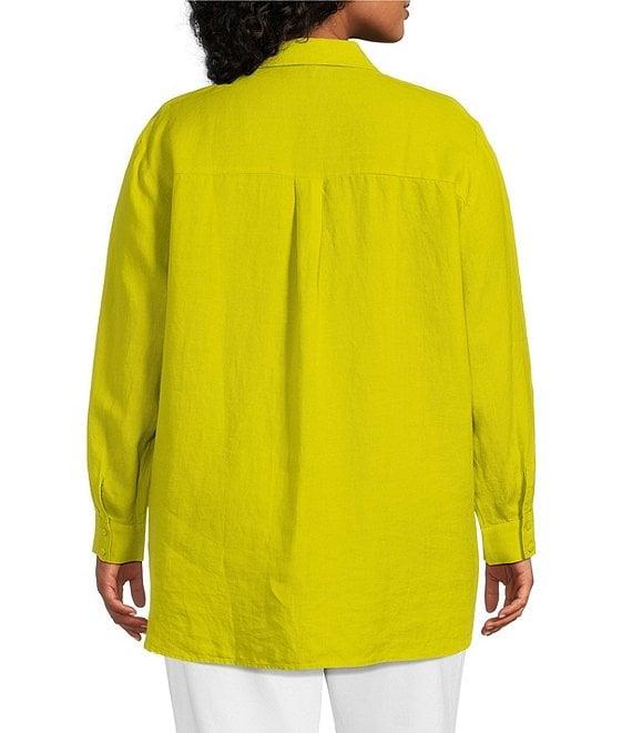 From Eileen Fisher plus, this shirt features: Organic linen fabrication Point collar neckline Long sleeves Round hem Button front closure Approx. 32.5" length Organic linen Machine wash Imported.
