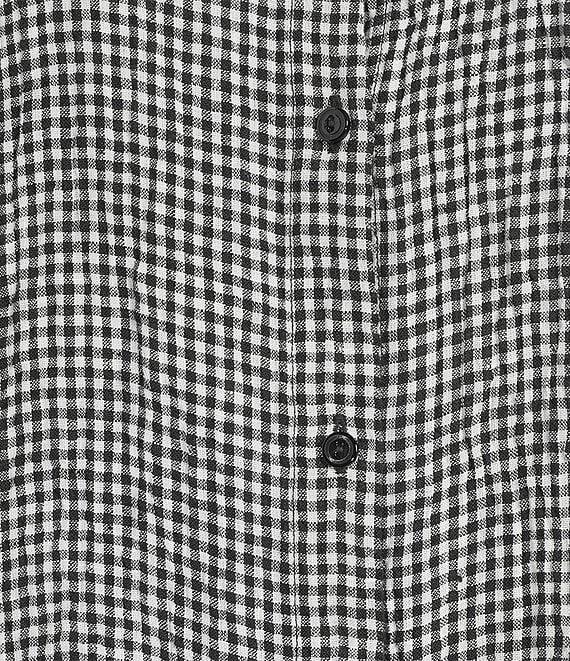 From Eileen Fisher, this top features:Puckered organic linen fabricationGingham printMandarin collar necklineShort sleevesStraight hemButton front closureApprox. 23" lengthOrganic linenMachine washImported.