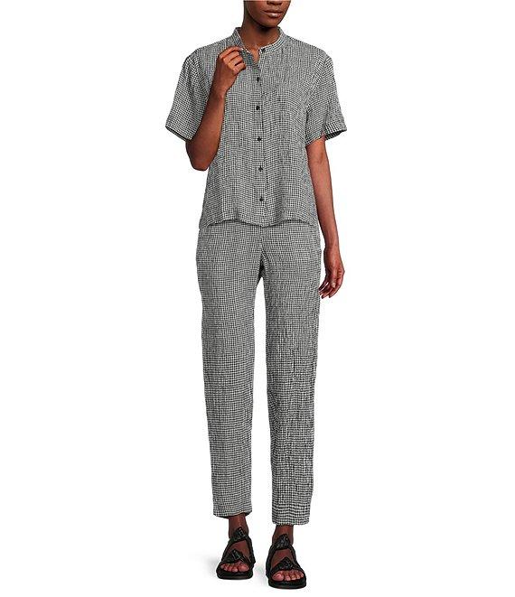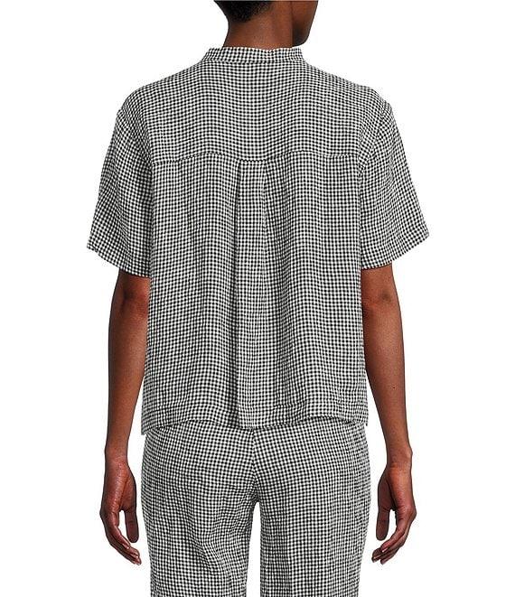 Eileen Fisher Puckered Organic Linen Gingham Mandarin Collar Short Sleeve Coordinating Top