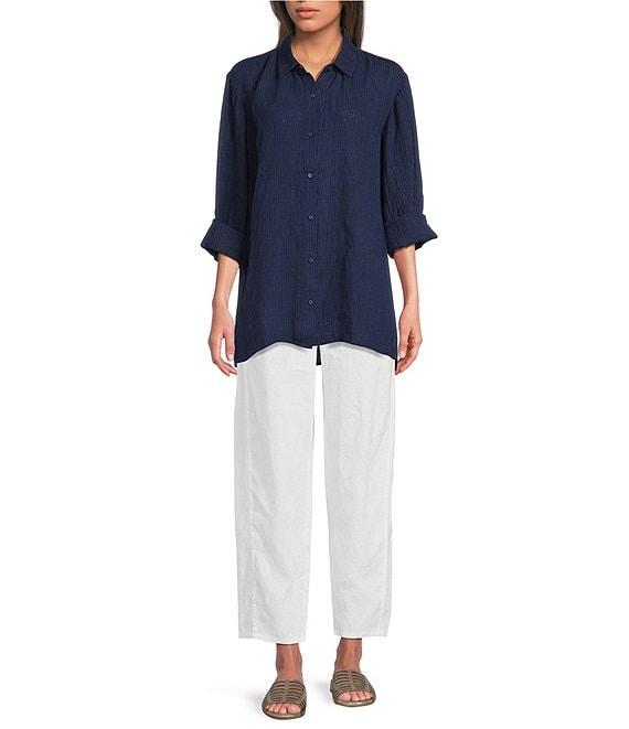 Eileen Fisher Puckered Organic Linen Point Collar Long Sleeve Top