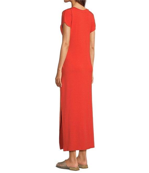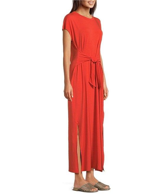 From Eileen Fisher, this dress features; Stretch jersey fabrication Crew neckline Cap sleeves Tie waist Straight hem with side slits Pullover construction Approx. 53" length Tencel/lyocell/spandex Machine wash Imported.