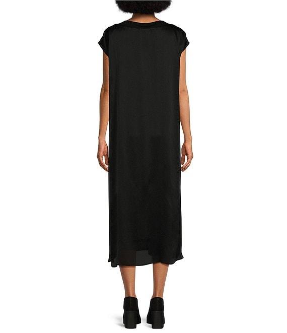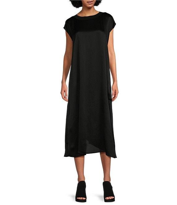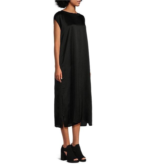 From Eileen Fisher, this dress features: Lustrous silk with fine lines of vertical texture fabrication Silk ribbed boat neckline Cap sleeves Boxy fit Straight hemline with side slits Pullover construction Approx. 50" in length Silk Hand wash Imported.