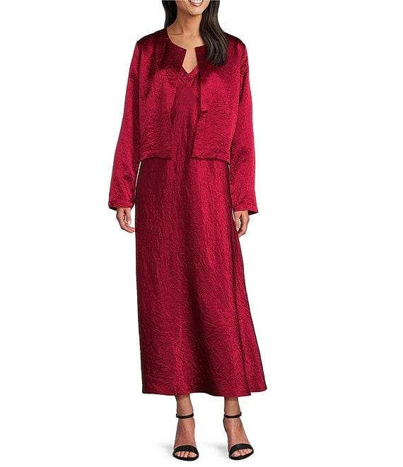 From Eileen Fisher, this jacket features: Textured satin fabrication Round neckline Long sleeves Cropped Straight hem Side pockets Open front Approx. 21" length Acetate Machine wash Imported.