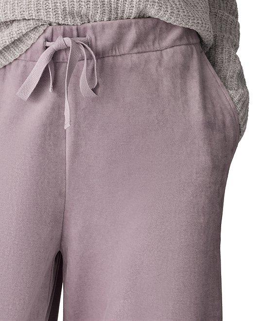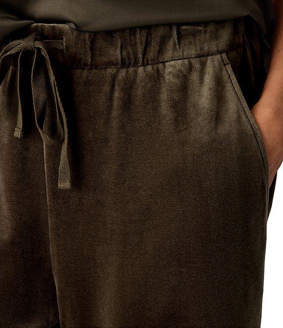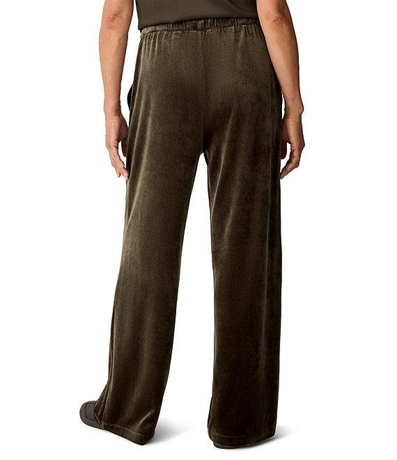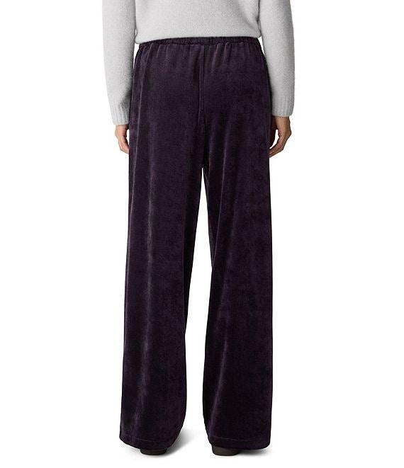 From Eileen Fisher, these pants feature: Velvety velour knit fabrication Mid-rise Elastic drawstring waistband Wide leg silhouette Pull-on construction Approx. 29.5" inseam; 10.75" front rise; 16.75" back rise Organic cotton/tencel lyocell Machine wash Imported.
