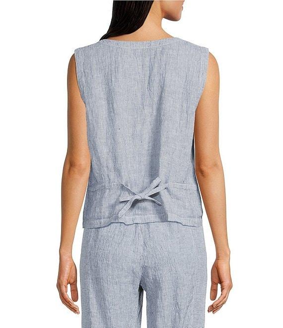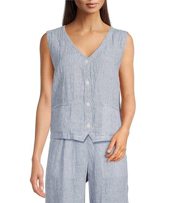Eileen Fisher Yarn-Dyed Stripe Puckered Organic Linen V-Neck Sleeveless Vest