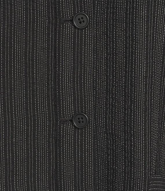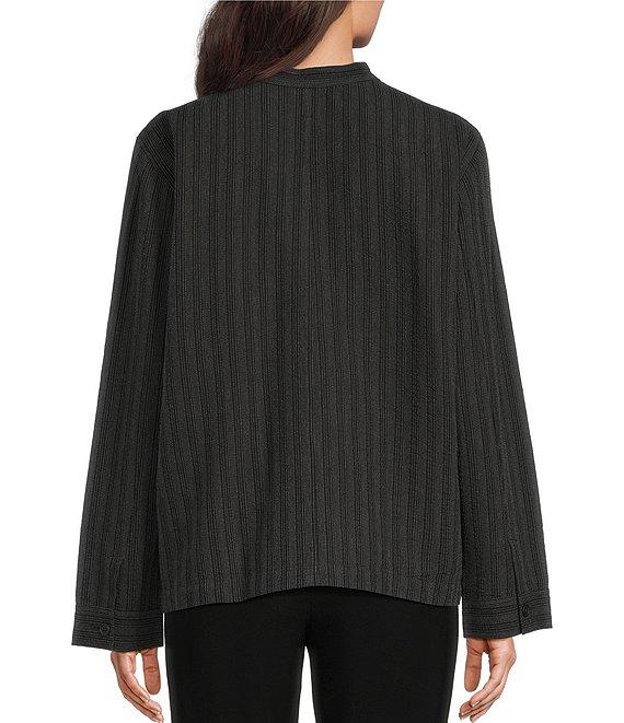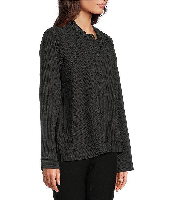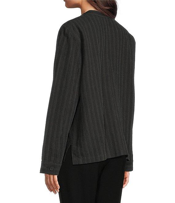 From Eileen Fisher, this jacket features: Organic cotton blend fabrication Stripe print Mandarin collar neckline Long sleeves Front patch pockets Straight hem Button front closure Approx. 24" length Organic cotton/tencel lyocell/spandex Machine wash Imported.