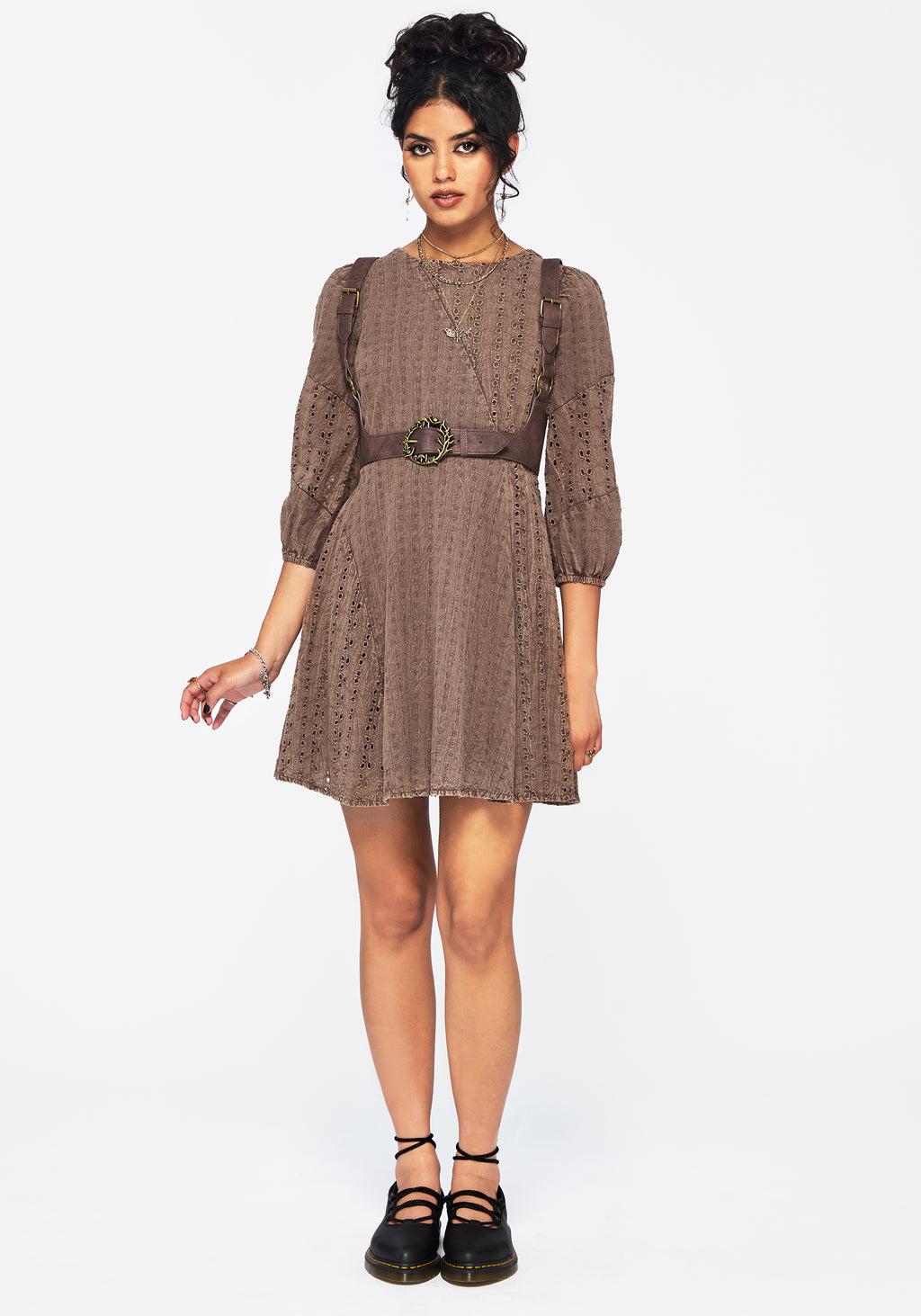 Brown Buckled Harness Mushroom and Fern Buckle Adjustable Shoulder Straps Gold Hardware 100% Polyurethane (Polyester)