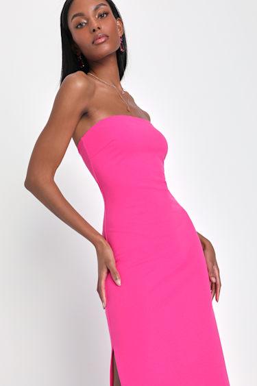 With the Lulus Elaborate Excellence Hot Pink Strapless Bodycon Maxi Dress, you'll never look anything less than fabulous! This must-have dress is composed of stretchy crepe knit that creates a darted strapless bodice and a straight neckline (with hidden no-slip strips). The curve-flaunting silhouette cascades down to a sophisticated maxi hem, adorned with a side seam slit for a sultry finishing touch! Hidden back zipper/clasp.