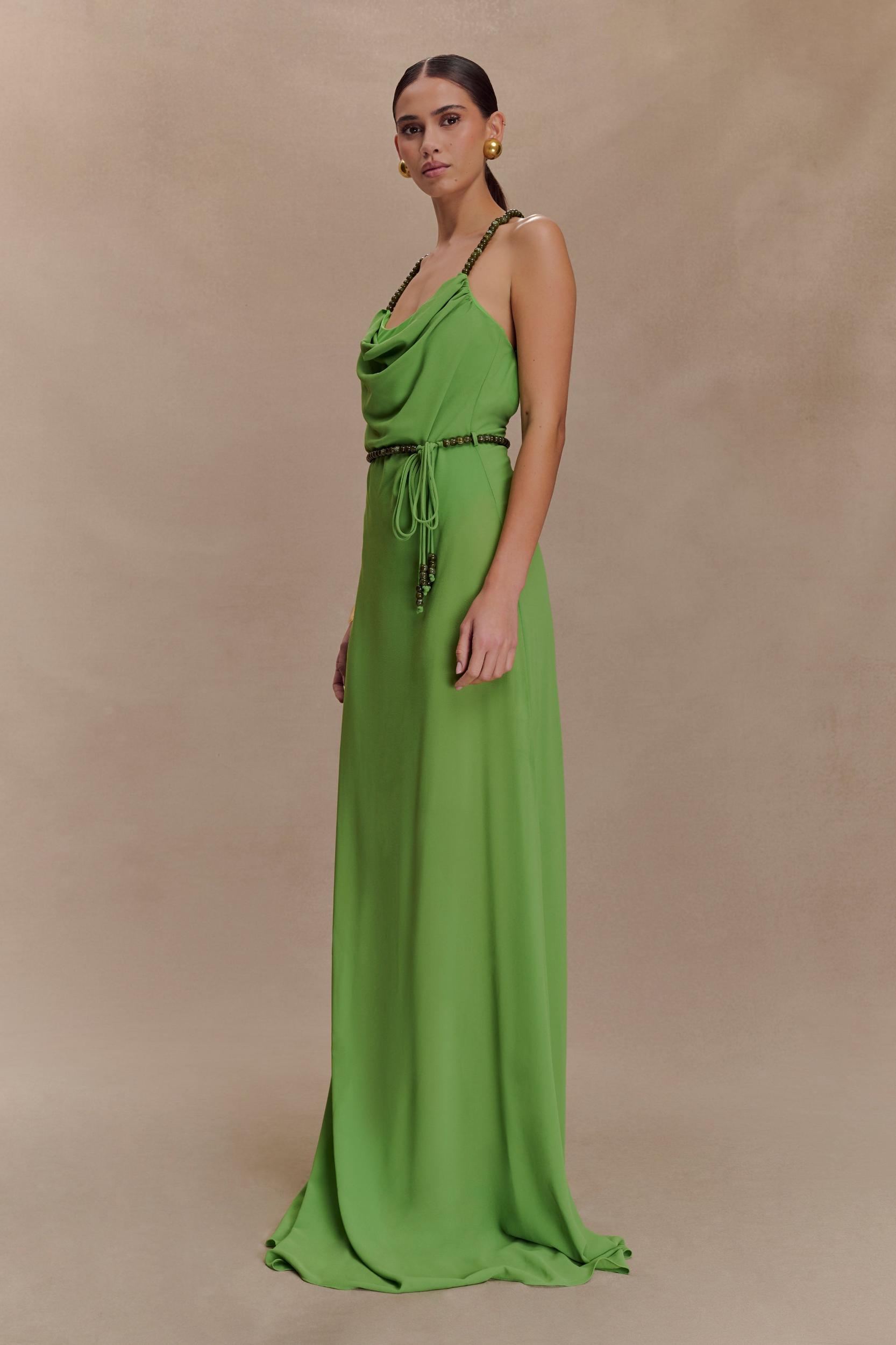 Make an entrance. Float into the spotlight in the ELAINE Chiffon Beaded Maxi Dress — a vision of ethereal elegance and refined glamour. Featuring shimmering beaded straps and a matching belt, this dress exudes sophistication from every angle. The delicate cowl neckline flatters the décolletage, while the beaded straps cross over at the back for a striking finish. Designed with a built-in one-piece bodysuit for seamless support and comfort, it skims the figure in a flattering silhouette before cascading to a full-length maxi hem. The side zipper ensures a smooth fit, making this dress your go-to for unforgettable evenings.